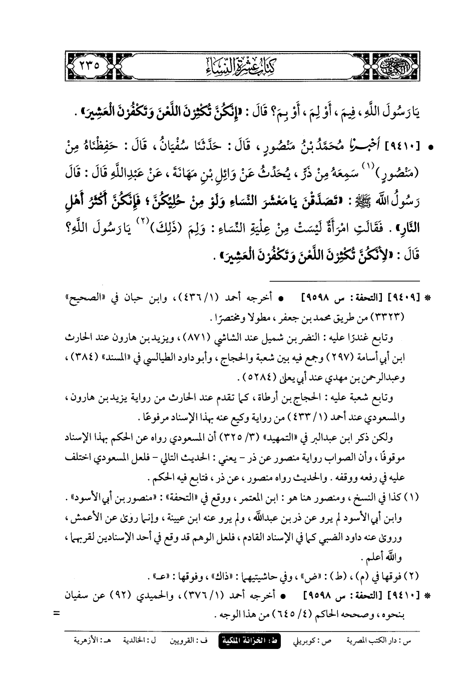 9409- أَخبَرنا مُحَمدُ بنُ بَشَّارٍ، قَالَ: حَدثنا مُحَمدٌ، قَالَ: حَدثنا شُعبَةُ، عَنِ الحَكَمِ، قَالَ: سَمِعْتُ ذَرًّا يُحَدِّثُ عَن وَائِلِ بنِ مَهَانَةَ، عَنِ ابنِ مَسْعُودٍ، عَنِ النَّبيِّ صَلى الله عَلَيهِ وسَلم قَالَ لِلنِّسَاءِ: تَصَدَّقْنَ، فَإِنَّكُنَّ أَكْثَرُ أَهْلِ النَّارِ، فَقَالَتِ امْرَأَةٌ: يَا رَسُولَ اللهِ، فِيمَ؟ أَوْ لِمَ؟ أَوْ بِمَ؟ قَالَ: إِنَّكُنَّ تُكْثِرْنَ اللَّعْنَ، وَتَكْفُرْنَ العَشِيرَ.