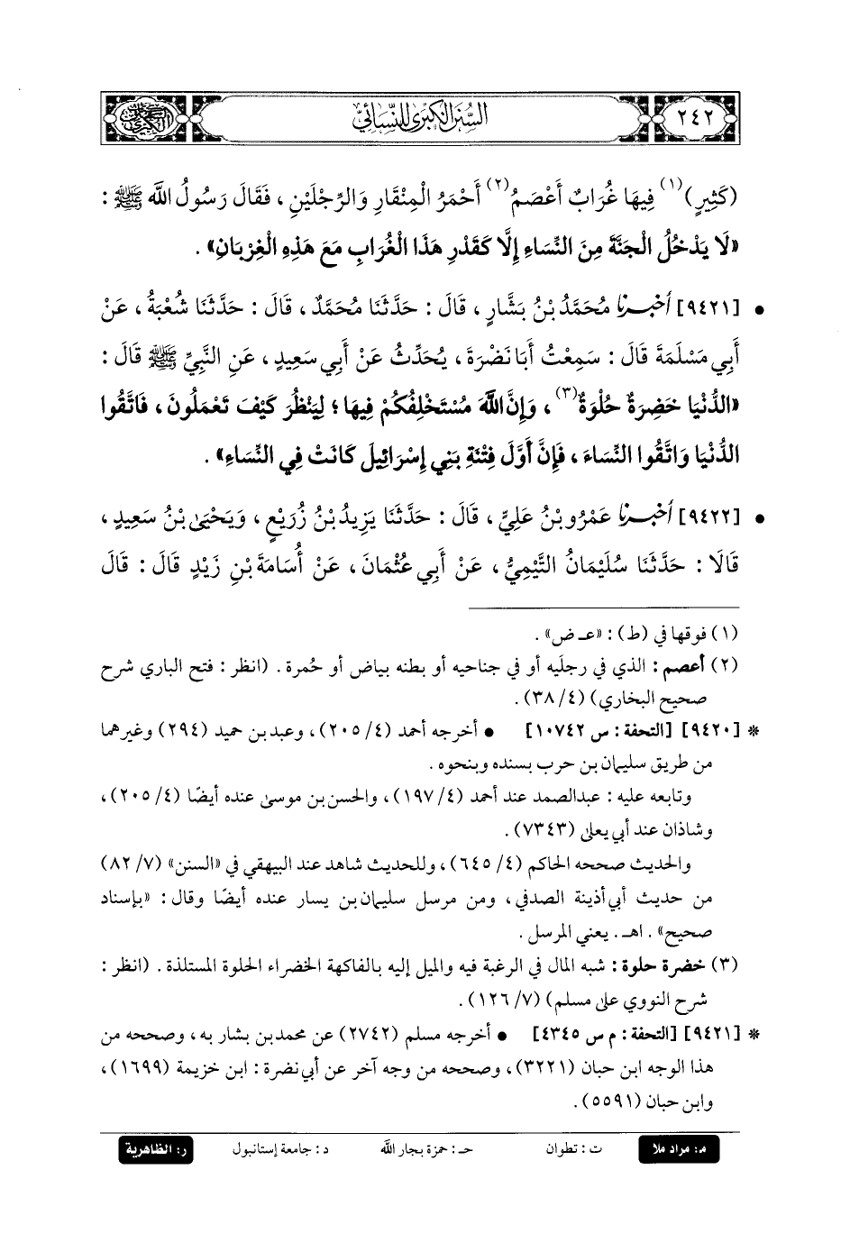 9421- أَخبَرنا مُحَمدُ بنُ بَشَّارٍ، قَالَ: حَدثنا مُحَمدٌ، قَالَ: حَدثنا شُعبَةُ، عَن أَبي مَسْلَمَةَ، قَالَ: سَمِعْتُ أَبَا نَضْرَةَ يُحَدِّثُ عَن أَبي سَعِيدٍ، عَنِ النَّبيِّ صَلى الله عَلَيهِ وسَلم قَالَ: الدُّنْيَا خَضِرَةٌ حُلْوَةٌ، وَإِنَّ اللهَ مُسْتَخْلِفُكُمْ فِيهَا، لِيَنْظُرَ كَيْفَ تَعْمَلُونَ، فَاتَّقُوا الدُّنْيَا وَاتَّقُوا النِّسَاءَ، فَإِنَّ أَوَّلَ فِتْنَةِ بَنِي إِسرَائِيلَ كَانَتْ فِي النِّسَاءِ.