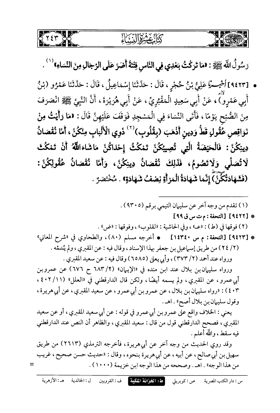 9422- أَخبَرنا عَمْرُو بنُ عَليٍّ، قَالَ: حَدثنا يَزِيدُ بنُ زُرَيْعٍ، وَيَحيَى بنُ سَعِيدٍ، قَالا: حَدثنا سُلَيمَانُ التَّيْمِيُّ، عَن أَبي عُثْمَانَ، عَن أُسَامَةَ بنِ زَيْدٍ قَالَ: قَالَ رَسُولُ اللهِ صَلى الله عَلَيهِ وسَلم: مَا تَرَكْتُ بَعْدِي فِي النَّاسِ فِتْنَةً أَضَرَّ عَلَى الرِّجَالِ مِنَ النِّسَاءِ.
