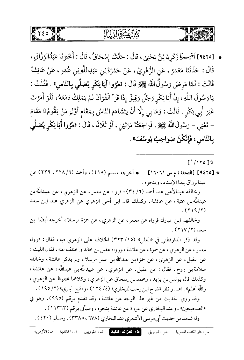 9424- أَخبَرنا صَفْوَانُ بنُ عَمْرٍو، قَالَ: حَدثنا بِشْرٌ، قَالَ: أَخْبَرَنِي أَبي، عَنِ الزُّهْرِيِّ، قَالَ: أَخْبَرَنِي حَمْزَةُ بنُ عَبدِ اللهِ بنِ عُمَرَ، أَنَّ عَبدَ اللهِ بْنَ عُمَرَ قَالَ: لَمَّا اشْتَكَى رَسُولُ اللهِ صَلى الله عَلَيهِ وسَلم شَكْوَهُ الَّذِي تُوُفِّيَ فِيهِ، قَالَ: لَيُصَلِّ لِلنَّاسِ أَبو بَكْرٍ، قَالَتْ عَائِشَةُ: يَا رَسُولَ اللهِ، إِنَّ أَبَا بَكْرٍ رَجُلٌ رَقِيقٌ، وَإِنَّهُ لا يَمْلِكُ دَمْعَهُ حِينَ يَقْرَأُ القُرْآنَ، فَمُرْ عُمَرَ بْنَ الخَطَّابِ يُصَلِّي لِلنَّاسِ، فَقَالَ رَسُولُ اللهِ صَلى الله عَلَيهِ وسَلم: لِيُصَلِّ لِلنَّاسِ أَبو بَكْرٍ، فَرَاجَعَتْهُ عَائِشَةُ، فَقَالَ: لَيُصَلِّ لِلنَّاسِ أَبو بَكْرٍ، فَإِنَّكُنَّ صَوَاحِبُ يُوسُفَ.