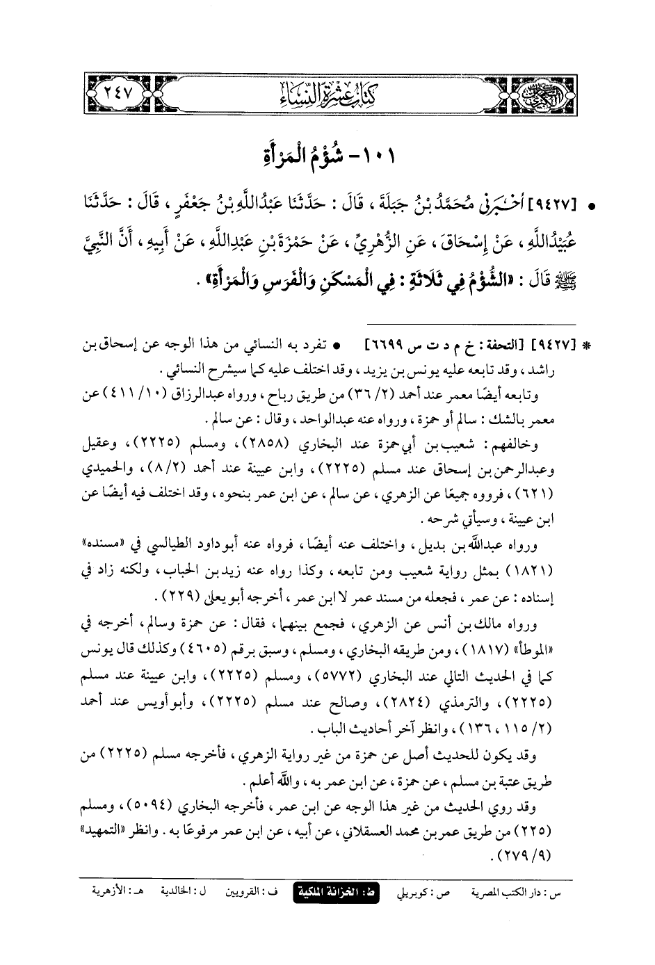 9426- أَخْبَرَنِي مُحَمدُ بنُ إِسمَاعِيلَ بنِ إِبْرَاهِيمَ، قَالَ: حَدثنا يَزِيدُ، قَالَ: أَخبَرنا حَمَّادٌ، عَنِ ابنِ سَخْبَرَةَ، عَنِ القَاسِمِ بنِ مُحَمدٍ، عَن عَائِشَةَ، عَنِ النَّبيِّ صَلى الله عَلَيهِ وسَلم قَالَ: أَعْظَمُ النِّسَاءِ بَرَكَةً أَيْسَرُهُنَّ مَؤُونَةً.