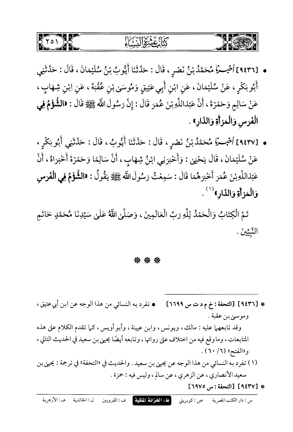 9436- أَخبَرنا مُحَمدُ بنُ نَصْرٍ، قَالَ: حَدثنا أَيوبُ بنُ سُلَيمَانَ، قَالَ: حَدَّثني أَبو بَكْرٍ، عَن سُلَيمَانَ، عَنِ ابنِ أَبي عَتِيقٍ، وَمُوسَى بنِ عُقْبَةَ، عَنِ ابنِ شِهَابٍ، عَن سَالِمٍ، وَحَمْزَةَ، أَنَّ عَبدَ اللهِ بْنَ عُمَرَ قَالَ: إِنَّ رَسُولَ اللهِ صَلى الله عَلَيهِ وسَلم قَالَ: الشُّؤْمُ فِي الفَرَسِ، وَالمَرْأَةِ، وَالدَّارِ.