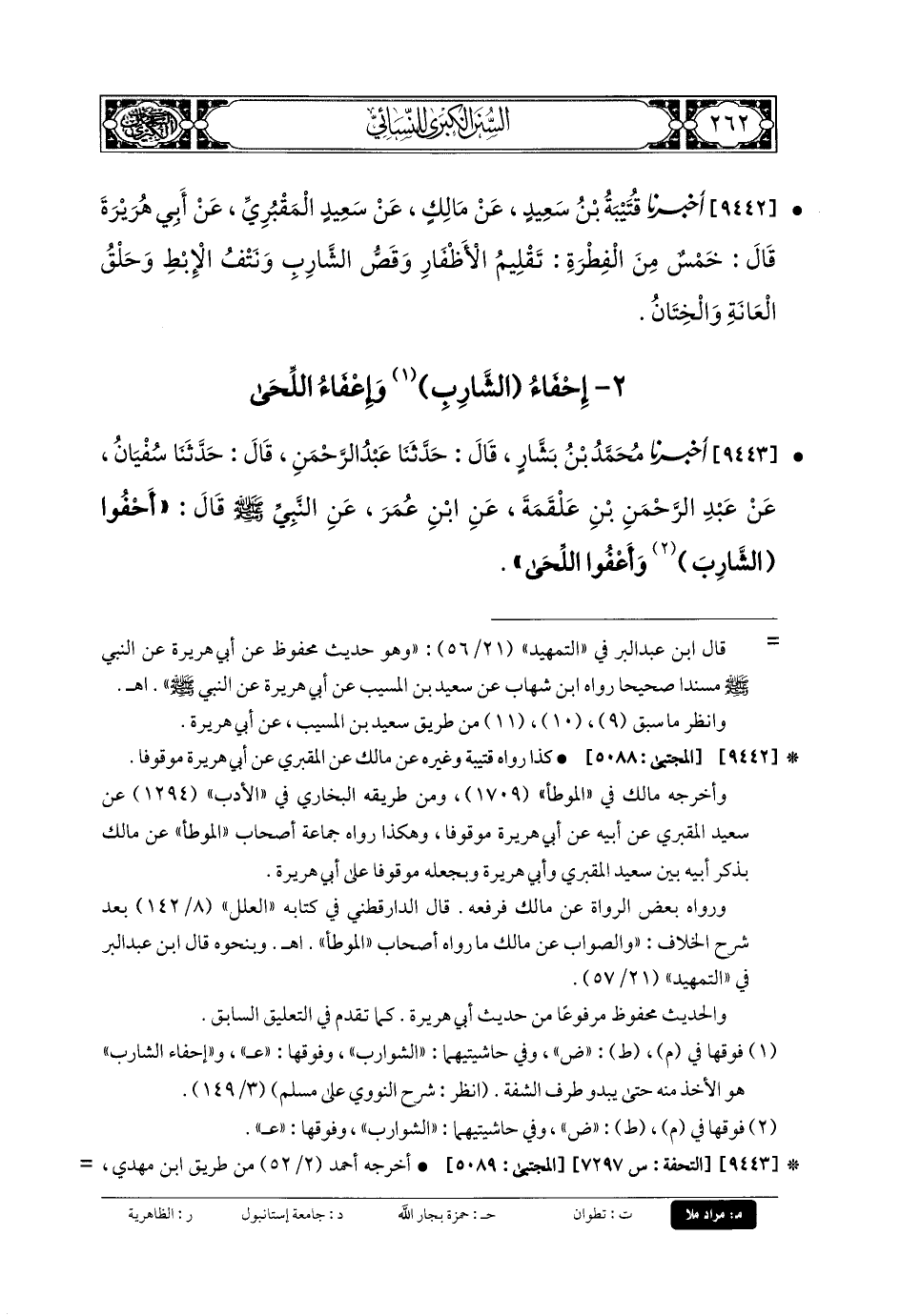 9441- أَخبَرنا حُمَيْدُ بنُ مَسْعَدَةَ، عَن بِشْرٍ، قَالَ: حَدثنا عَبدُ الرَّحمَنِ بنُ إِسحَاقَ، عَن سَعِيدٍ المَقْبُرِيِّ، عَن أَبي هُرَيْرَةَ قَالَ: قَالَ رَسُولُ اللهِ صَلى الله عَلَيهِ وسَلم: خَمْسٌ مِنَ الفِطْرَةِ: الخِتَانُ، وَحَلْقُ العَانَةِ، وَنَتْفُ الضَّبْعِ، وَتَقْلِيمُ الظُّفْرِ، وَتَقْصِيرُ الشَّارِبِ.