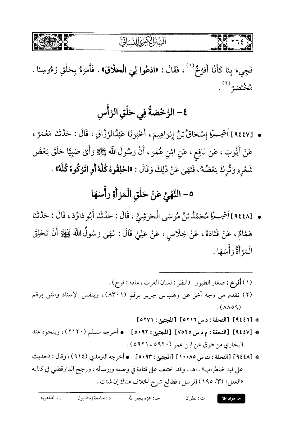 9447- أَخبَرنا إِسحَاقُ بنُ إِبْرَاهِيمَ، أَخبَرنا عَبدُ الرَّزَّاقِ، قَالَ: حَدثنا مَعْمَرٌ، عَن أَيوبَ، عَن نَافِعٍ، عَنِ ابنِ عُمَرَ، أَنَّ رَسُولَ اللهِ صَلى الله عَلَيهِ وسَلم رَأَى صَبِيًّا حلقَ بَعْضُ شَعْرِهِ وَتُرِكَ بَعْضَهُ، فَنَهَى عَن ذَلِكَ وَقَالَ: احْلِقُوهُ كُلَّهُ، أَوِ اتْرُكُوهُ كُلَّهُ.