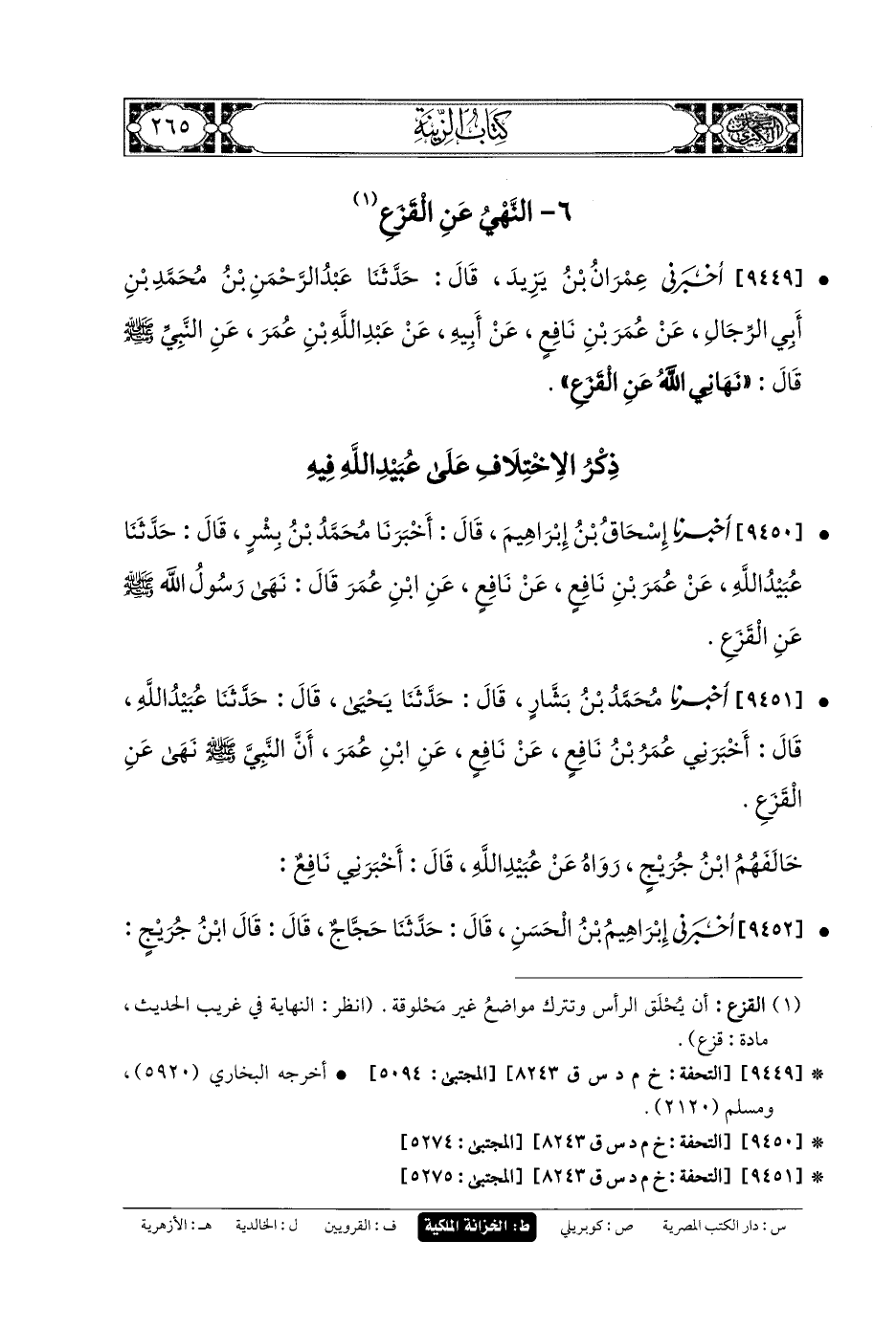 9451- أَخبَرنا مُحَمدُ بنُ بَشَّارٍ، قَالَ: حَدثنا يَحيَى، قَالَ: حَدثنا عُبَيدُ اللهِ، قَالَ: أَخْبَرَنِي عُمَرُ بنُ نَافِعٍ، عَن نَافِعٍ، عَنِ ابنِ عُمَرَ، أَنَّ النَّبيَّ صَلى الله عَلَيهِ وسَلم نَهَى عَنِ القَزَعِ.