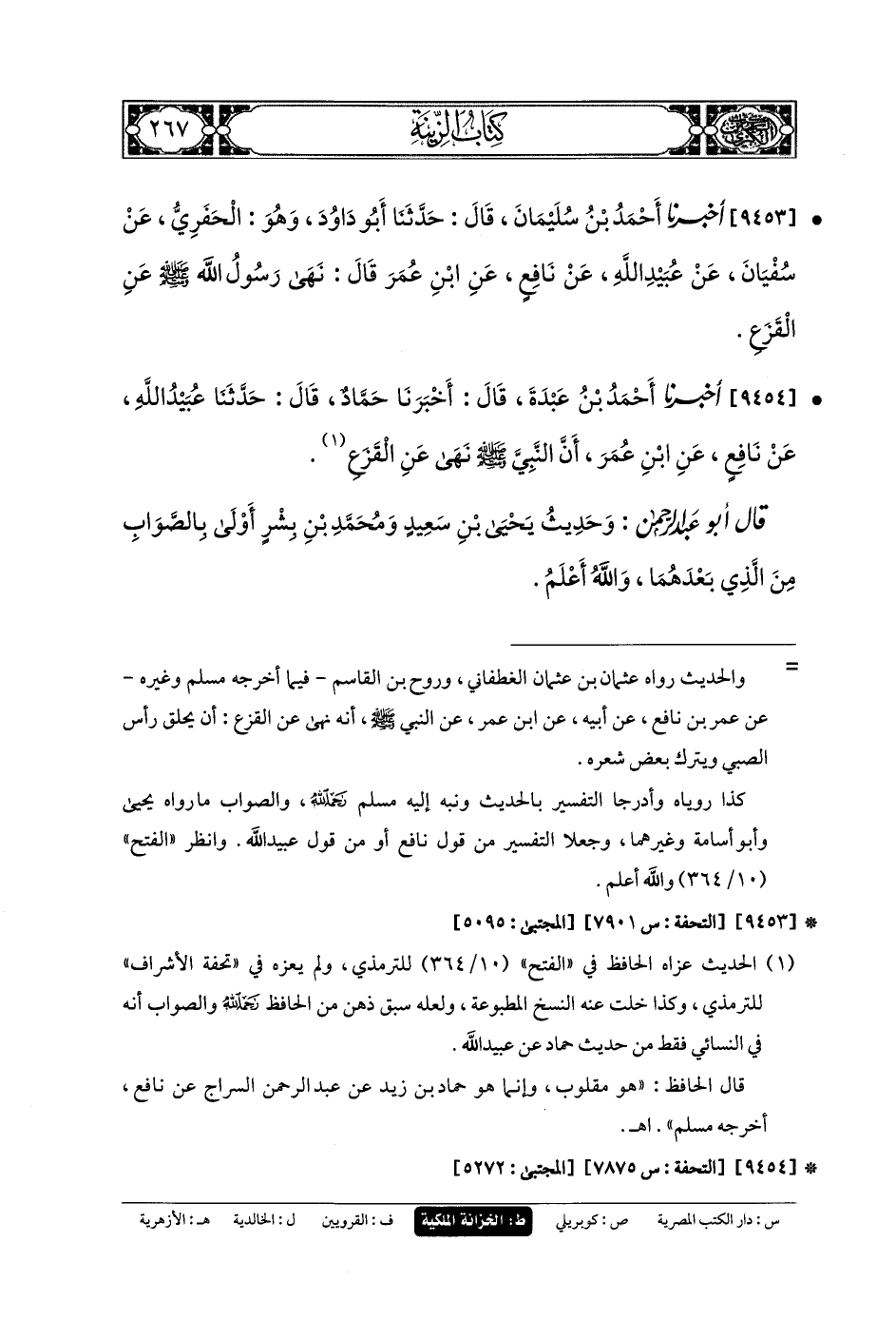 9453- أَخبَرنا أَحْمَدُ بنُ سُلَيمَانَ، قَالَ: حَدثنا أَبو دَاوُدَ، وَهُوَ الحَفَرِيُّ، عَن سُفيانَ، عَن عُبَيدِ اللهِ، عَن نَافِعٍ، عَنِ ابنِ عُمَرَ قَالَ: نَهَى رَسُولُ اللهِ صَلى الله عَلَيهِ وسَلم عَنِ القَزَعِ.