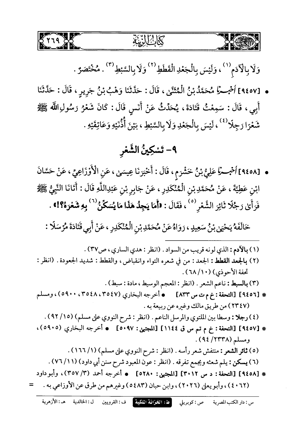 9457- أَخبَرنا مُحَمدُ بنُ المُثَنَّى، قَالَ: حَدثنا وَهْبُ بنُ جَرِيرٍ، قَالَ: حَدثنا أَبي، قَالَ: سَمِعْتُ قَتَادَةَ يُحَدِّثُ عَن أَنَسٍ قَالَ: كَانَ شَعْرُ رَسُولِ اللهِ صَلى الله عَلَيهِ وسَلم شَعْرًا رَجِلاً لَيْسَ بِالجَعْدِ، وَلا بِالسَّبْطِ، بَيْنَ أُذُنَيْهِ وَعَاتِقَيْهِ.