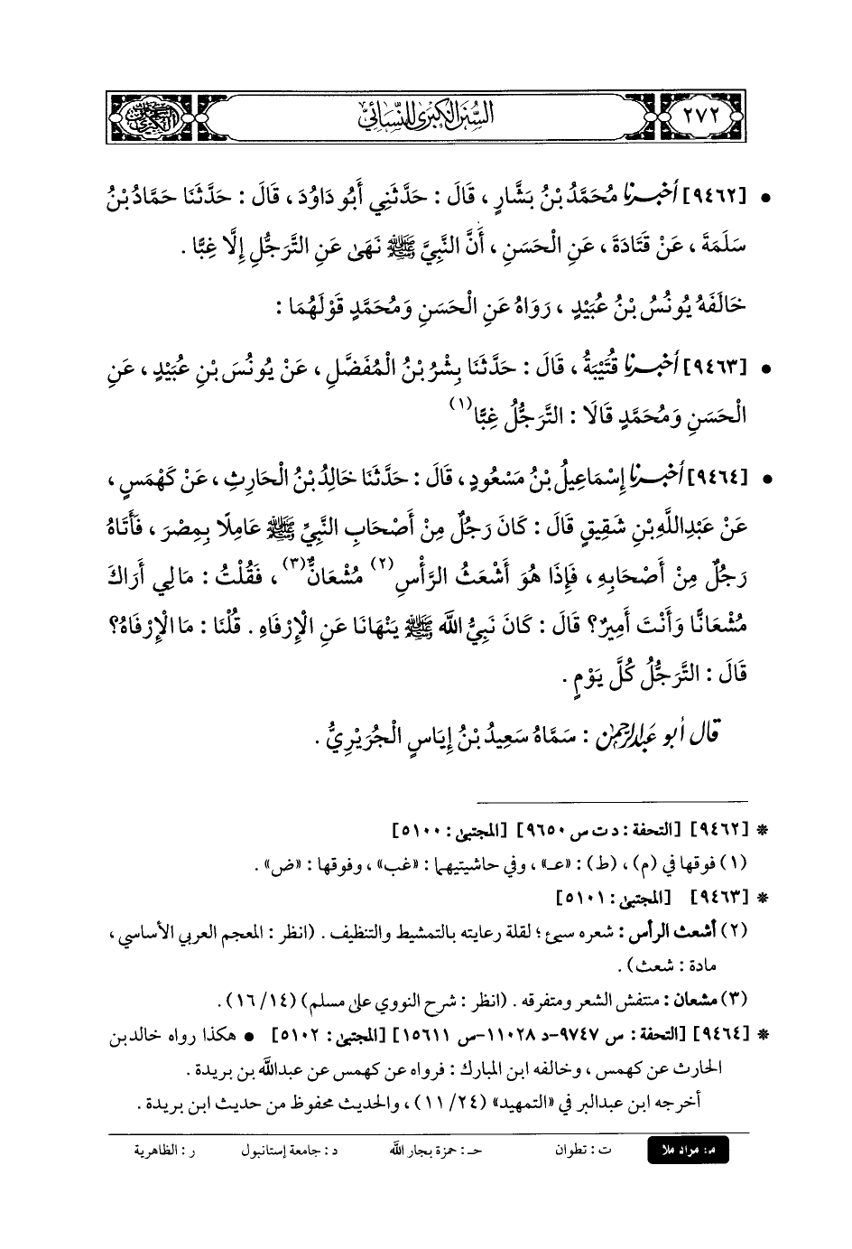 9462- أَخبَرنا مُحَمدُ بنُ بَشَّارٍ، قَالَ: حَدثني أَبو دَاوُدَ، قَالَ: حَدثنا حَمَّادُ بنُ سَلَمَةَ، عَن قَتَادَةَ، عَنِ الحَسَنِ، أَنَّ النَّبيَّ صَلى الله عَلَيهِ وسَلم نَهَى عَنِ التَّرَجُّلِ إِلاَّ غِبًّا.