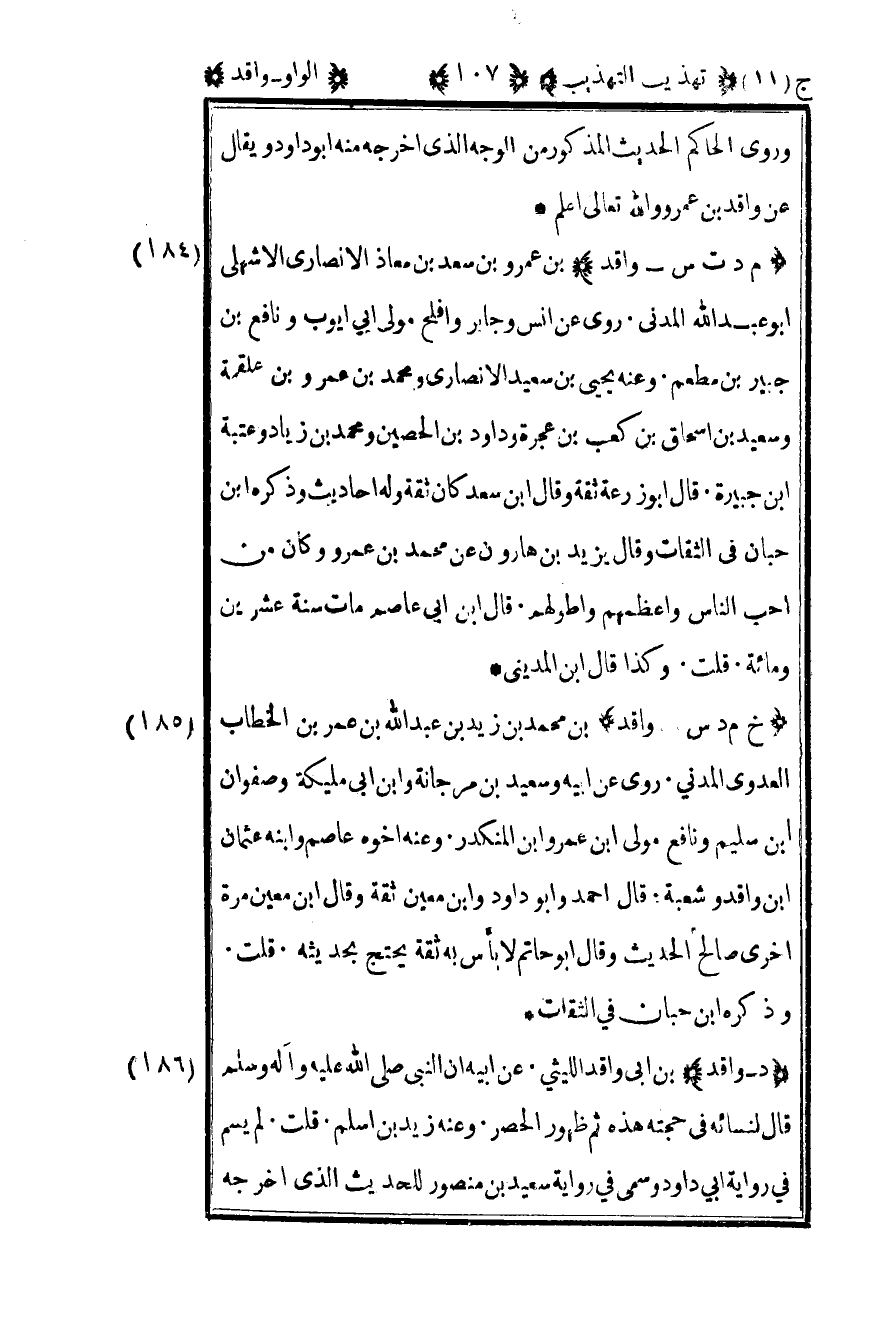 185-"خ م د س - واقد" بن محمد بن زيد بن عبد الله بن عمر بن الخطاب العدوي المدني روى عن أبيه وسعيد بن مرجانة وابن أبي مليكة وصوان بن سليم ونافع مولى بن عمر وابن المنكدر وعنه أخوه عاصم وابنه عثمان بن واقد وشعبة قال أحمد وأبو داود وابن معين ثقة وقال بن معين مرة أخرى صالح الحديث وقال أبو حاتم: لا بأس به ثقة يحتج بحديثه قلت: وذكره بن حبان في الثقات.
