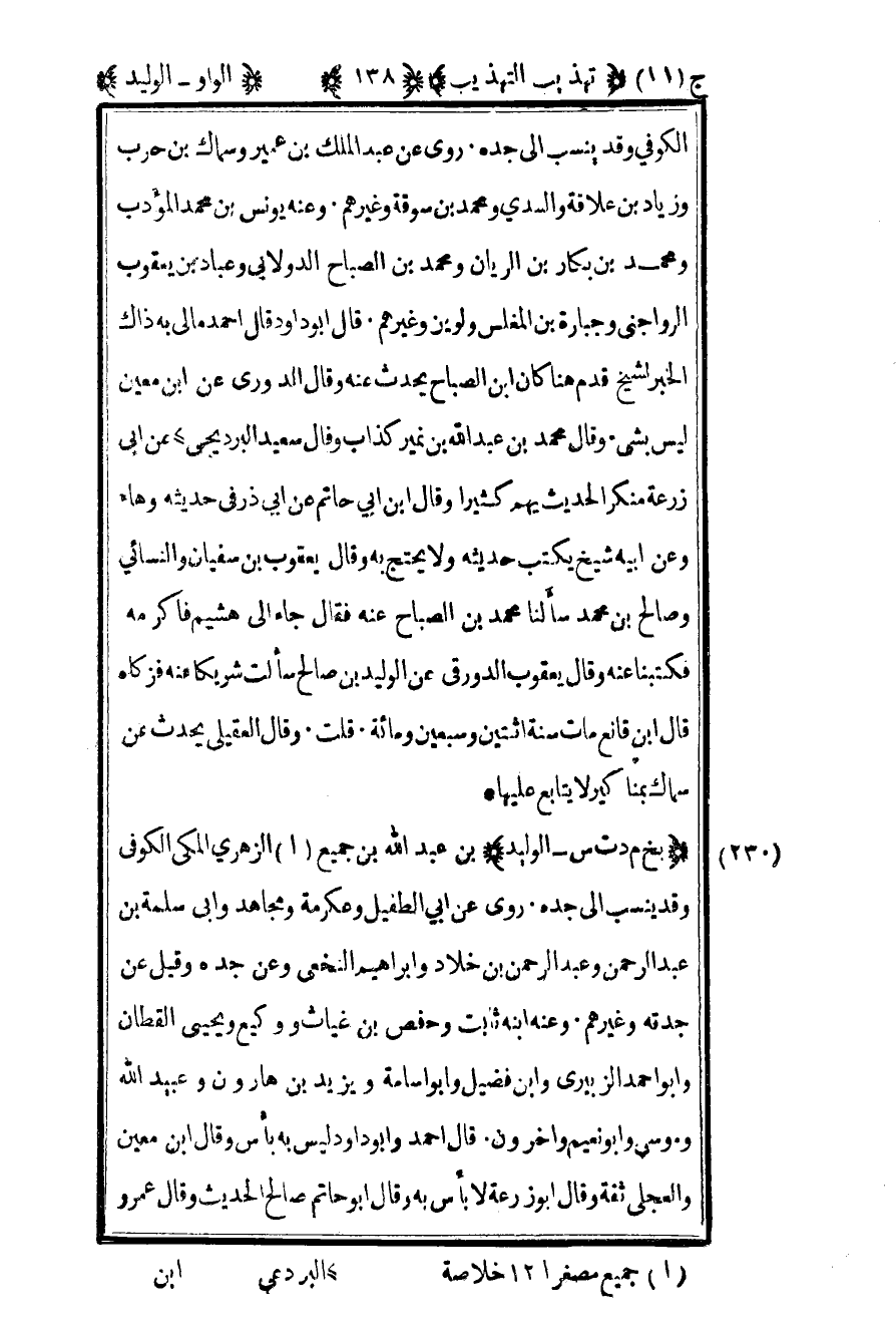 230 - "بخ م د ت س - الوليد" بن عبد الله بن جميع2 الزهري المكي الكوفي وقد ينسب إلى جده روى عن أبي الطفيل وعكرمة ومجاهد وأبي سلمة بن عبد الرحمن وعبد الرحمن بن خلاد وإبراهيم النخعي وعن جده وقيل عن جدته وغيرهم وعنه ابنه ثابت وحفص بن غياث ووكيع ويحيى القطان وأبو أحمد الزبيري وابن فضيل وأبو أسامة ويزيد بن هارون وعبيد الله وموسى وأبو نعيم وآخرون قال أحمد وأبو داود: ليس به بأس وقال بن معين والعجلي ثقة وقال أبو زرعة لا بأس به وقال أبو حاتم: صالح الحديث وقال عمرو