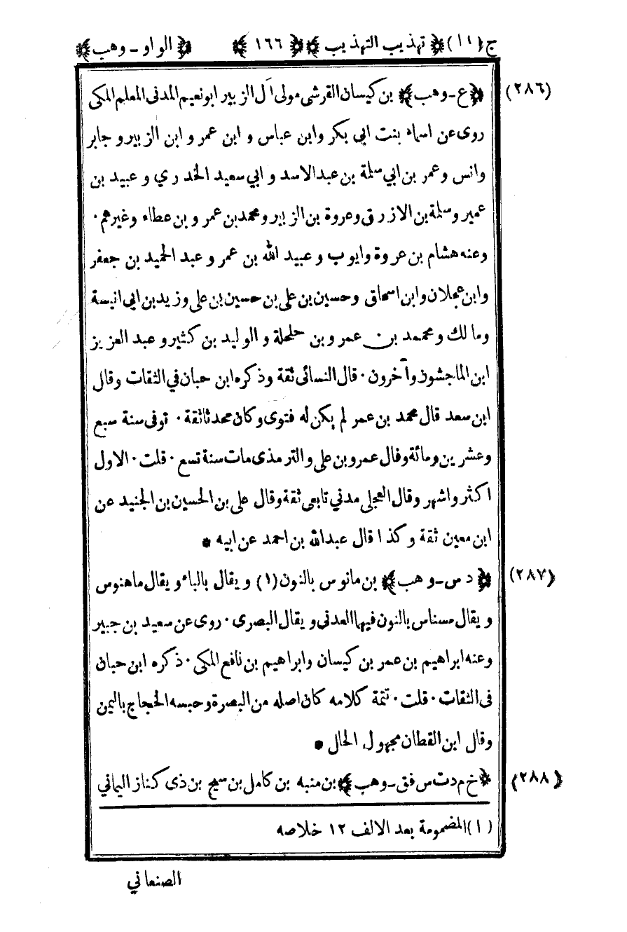 286- "ع – وهب" بن كيسان القرشي مولى آل الزبير أبو نعيم المدني المعلم المكي روى عن أسماء بنت أبي بكر وابن عباس وابن عمر وابن الزبير وجابر وأنس وعمر بن أبي سلمة بن عبد الأسد وأبي سعيد الخدري وعبيد بن عمير وسلمة بن الأزرق وعروة بن الزبير ومحمد بن عمرو بن عطاء وغيرهم وعنه هشام بن عروة وأيوب وعبيد الله بن عمر وعبد الحميد بن جعفر وابن عجلان وابن إسحاق وحسين بن علي بن حسين بن علي وزيد بن أبي أنيسة ومالك ومحمد بن عمرو بن حلحلة والوليد بن كثير وعبد العزيز بن الماجشون وآخرون قال النسائي: ثقة وذكره بن حبان في الثقات وقال بن سعد قال محمد بن عمر لم يكن له فتوى وكان محدثا ثقة توفي سنة سبع وعشرين ومائة وقال عمرو بن علي والترمذي مات سنة تسع قلت: الأول أكثر وأشهر وقال العجلي مدني تابعي ثقة وقال علي بن الحسين بن الجنيد عن بن معين ثقة وكذا قال عبد الله بن أحمد عن أبيه.