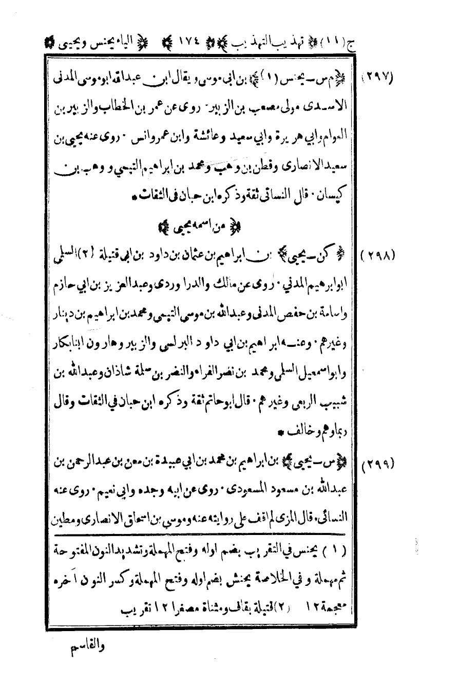 299 – "س – يحيى" بن إبراهيم بن محمد بن أبي عبيدة بن معن بن عبد الرحمن بن عبد الله بن مسعود المسعودي روى عن أبيه وجده وأبي نعيم روى عنه النسائي قال المزي لم أقف على روايته عنه وموسى بن إسحاق الأنصاري ومطين