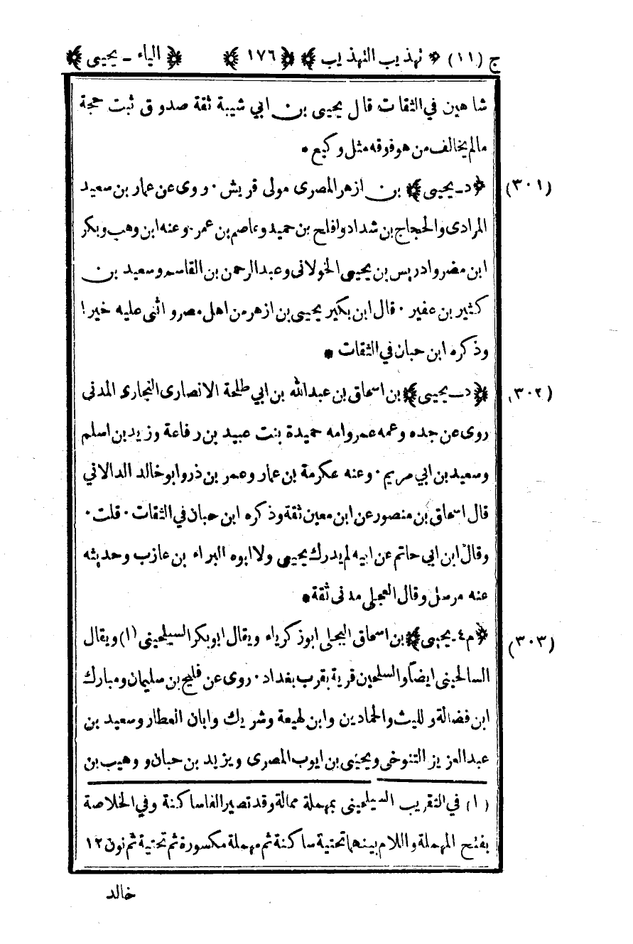 303- "م 4 – يحيى" بن إسحاق البجلي أبو زكريا ويقال أبو بكر السيلحيني1 ويقال السالحيني أيضا والسلحين قرية بقرب بغداد روى عن فليح بن سليمان ومبارك بن فضالة والليث والحمادين وابن لهيعة وشريك وأبان العطار وسعيد بن عبد العزيز التنوخي ويحيى بن أيوب المصري ويزيد بن حبان ووهيب بن