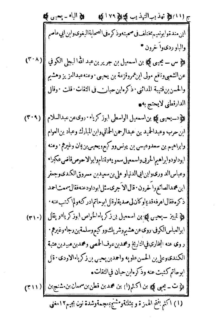 308 – "سي – يحيى" بن إسماعيل بن جرير بن عبد الله البجلي الكوفي عن الشعبي ونافع مولى بن عمر وقزعة بن يحيى وعنه عبد العزيز وهشيم والحسن بن قتيبة المدائني ذكره بن حبان في الثقات قلت: وقال الدارقطني: لا يحتج به.