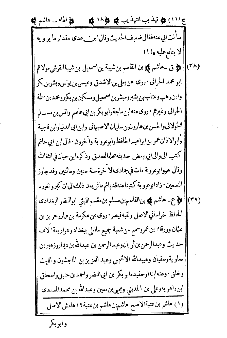 38 – "ق – هاشم" ابن القاسم بن شيبة بن إسماعيل بن شيبة القرشي مولاهم أبو محمد الحراني روى عن يعلى بن الأشدق وعيسى بن يونس وبشر بن بكر وابن وهب وعتاب بن بشير ومبشر بن إسماعيل ومسكين بن بكير ومحمد بن سلمة الحراني وغيرهم روى عنه بن ماجة وأبو بكر بن أبي عاصم وأنس بن مسلم الخولاني والحسن بن هارون بن سليمان الأصبهاني وابن أبي الدنيا وابن ناجية وأبو الأذان عمر بن إبراهيم الحافظ وأبو عروبة وآخرون قال بن أبي حاتم كتب إلي وإلى أبي ببعض حديثه محله الصدق وذكره بن حبان في الثقات وقال هو وأبو عروبة مات في جمادى الآخرة سنة ستين ومائتين وقد جاوز التسعين زاد أبو عروبة كتبنا عنه قديما ثم عاش بعد ذلك إلى أن كبر وتغير.