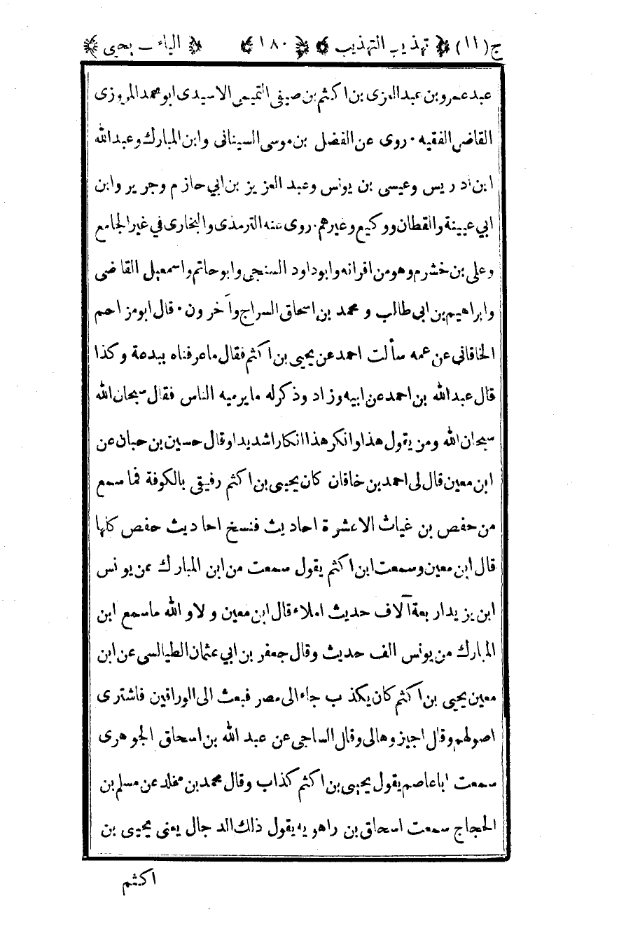 عبد عمرو بن عبد العزي بن أكثم بن صيفي التميمي الأسيدي أبو محمد المروزي القاضي الفقيه روى عن الفضل بن موسى السيناني وابن المبارك وعبد الله بن إدريس وعيسى بن يونس وعبد العزيز بن أبي حازم وجرير وابن أبي عيينة والقطان ووكيع وغيرهم روى عنه الترمذي والبخاري في غير الجامع وعلي بن خشرم وهو من أقرانه وأبو داود السنجي وأبو حاتم وإسماعيل القاضي وإبراهيم القاضي بن أبي طالب ومحمد بن إسحاق السراج وآخرون قال أبو مزاحم الخاقاني عن عمه سألت أحمد عن يحيى بن أكثم فقال ما عرفناه ببدعة وكذا قال عبد الله بن أحمد عن أبيه وزاد وذكر له ما يرميه الناس فقال سبحان الله سبحان الله ومن يقول هذا وأنكر هذا إنكارا شديدا وقال حسين بن حبان عن بن معين قال لي أحمد بن خاقان كان يحيى بن أكثم رفيقي بالكوفة فما سمع من حفص بن غياث إلا عشرة أحاديث فنسخ أحاديث حفص كلها قال بن معين وسمعت بن أكثم يقول سمعت من بن المبارك عن يونس بن يزيد أربعة آلاف حديث إملاء قال بن معين ولا والله ما سمع بن المبارك من يونس ألف حديث وقال جعفر بن أبي عثمان الطيالسي عن بن معين يحيى بن أكثم كان يكذب جاء إلى مصر فبعث إلى الوراقين فاشترى أصولهم وقال اجيزوها لي وقال الساجي عن عبد الله بن إسحاق الجوهري سمعت أبا عاصم يقول يحيى بن أكثم كذاب وقال محمد بن مخلد عن مسلم بن الحجاج سمعت إسحاق بن راهويه يقول ذلك الدجال يعني يحيى بن أكثم يحدث عن بن المبارك وقال بن أبي حاتم سألت أبي عنه فقال فيه نظر قلت: فما تقول فيه قال نسأل الله تعالى السلامة قال وسمعت علي بن الجنيد يقول كانوا لا يشكون أن يحيى كان يسرق الحديث وقال صالح بن محمد كان عنده حديث كثير إلا أني لم اكتب عنه وذلك أنه يحدث عن عبد الله بن إدريس بأحاديث لم يسمعها منه وقال في موضع آخر أكره الحديث والله عنه وذكر كلمة وقال الله الأزدي يتكلمون فيه روى عن الثقات عجائب لا يتابع عليها وقال الخرائطي عن فضلك الرازي قال مضيت أنا وداود بن علي إلى يحيى بن