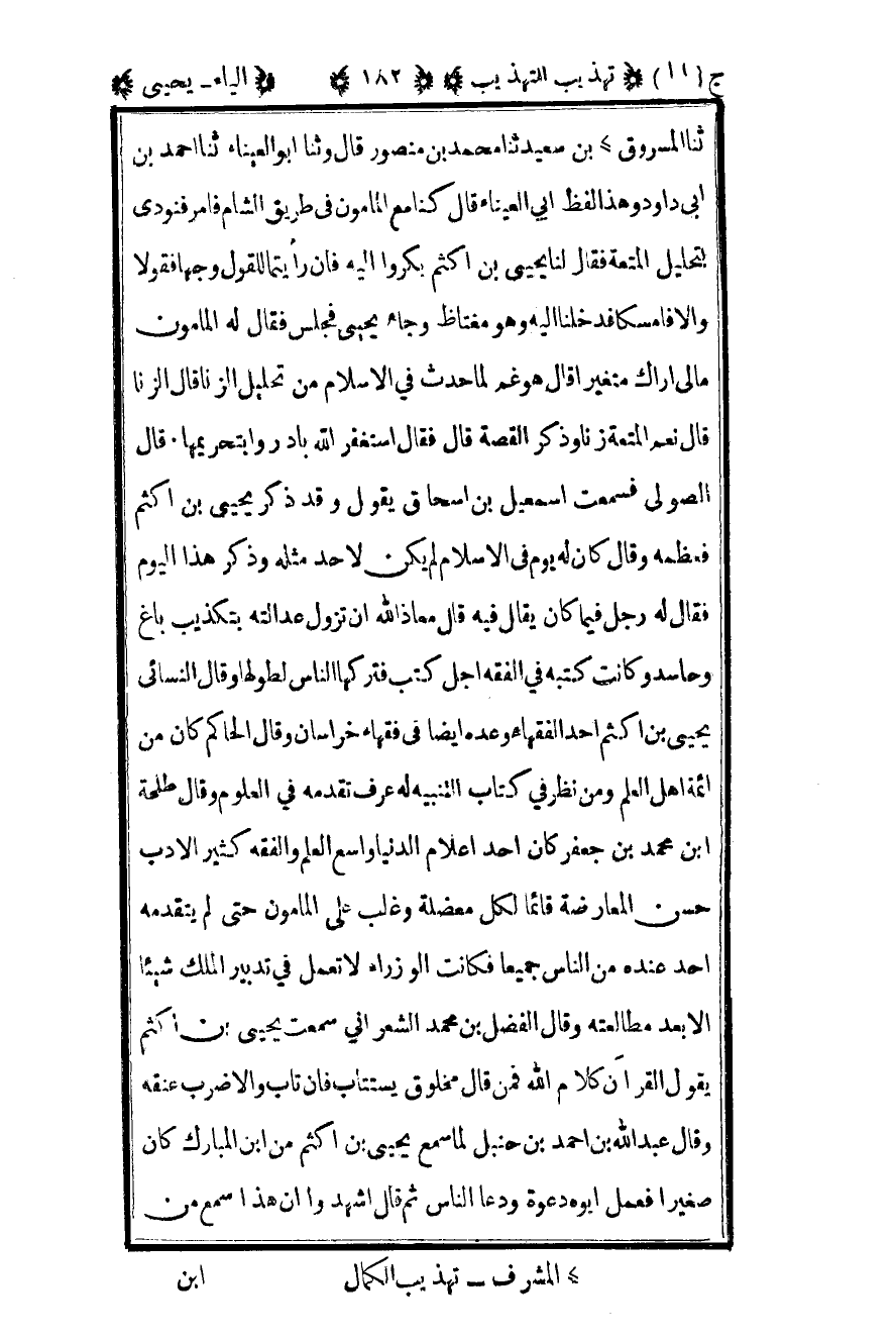 ثنا المسروق1 بن سعيد ثنا محمد بن منصور قال وثنا أبو العيناء ثنا أحمد بن أبي داود وهذا لفظ أبي العيناء قال كنا مع المأمون في طريق الشام فأمر فنودي بتحليل المتعة فقال لنا يحيى بن أكثم بكروا اليه فإن رأيتما للقول وجها فقولا وإلا فأمسكا فدخلنا إليه وهو مغتاظ وجاء يحيى فجلس فقال له المأمون مالي أراك متغيرا قال هو غم لما حدث في الإسلام من تحليل الزنا قال الزنا قال نعم المتعة زنا وذكر القصة قال فقال استغفر الله بادروا بتحريمها قال الصولي فسمعت إسماعيل بن إسحاق يقول قد ذكر يحيى بن أكثم فعظمه وقال كان له يوم في الإسلام لم يكن لأحد مثله وذكر هذا اليوم فقال له رجل فيما كان يقال فيه قال معاذ الله أن تزول عدالته بتكذيب باغ وحاسد وكانت كتبه في الفقه أجل كتب فتركها الناس لطولها وقال النسائي: يحيى بن أكثم أحد الفقهاء وعده أيضا في فقهاء خراسان وقال والحاكم كان من أئمة أهل العلم ومن نظر في كتاب التنبيه له عرف تقدمه في العلوم وقال طلحة بن محمد بن جعفر كان أحد أعلام الدنيا واسع العلم والفقه كثير الأدب حسن المعارضة قائما لكل معضلة وغلب على المأمون حتى لم يتقدمه أحد عنده من الناس جميعا فكانت الوزراء لا تعمل في تدبير الملك شيئا إلا بعد مطالعته وقال الفضل بن محمد الشعراني سمعت يحيى بن أكثم يقول القرآن كلام الله فمن قال خلوق يستتاب فإن تاب وإلا ضرب عنقه وقال عبد الله بن أحمد بن حنبل لما سمع يحيى بن أكثم من بن المبارك كان صغيرا فعمل أبوه دعوة ودعا الناس ثم قال اشهدوا وإن هذا سمع من