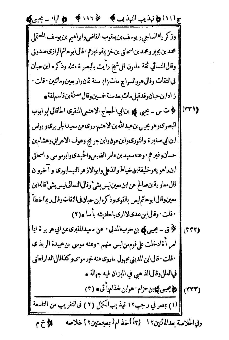 331- "ت س – يحيى" بن أبي الحجاج الأهتمي المنقري الخاقاني أبو أيوب البصري وهو يحيى بن عبد الله بن الأهتم روى عن سعيد الجريري ويونس بن أبي صغيرة والثوري وابن عون وابن جريج وعوف الأعرابي وهشام بن حسان وغيرهم وعنه سعيد بن عامر الضبعي والحميدي وأبو موسى وإسحاق بن راهويه وخليفة بن خياط والذهلي وأبو الأزهر النيسابوري وآخرون قال معاوية بن صالح عن بن معين: ليس بشيء وقال النسائي: ليس بشيء قاله بن معين وقال أبو حاتم: ليس بالقوي وذكره بن حبان في الثقات وقال ربما أخطأ قلت: وقال بن عدي لا أرى بأحاديثه بأسا2.