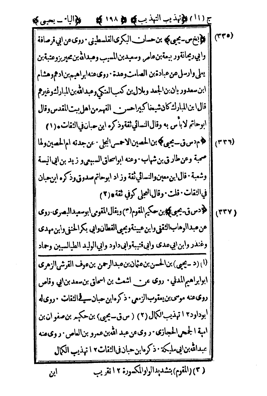 337 – "د س ق – يحيى" بن حكيم المقوم3 ويقال المقومي أبو سعيد البصري روى عن عبد الوهاب الثقفي وابن عيينة ويحيى القطان وأبي بكر الحنفي وابن مهدي وغندر وابن أبي عدي وأبي قتيبة وأبي داود وأبي الوليد الطيالسيين وحماد