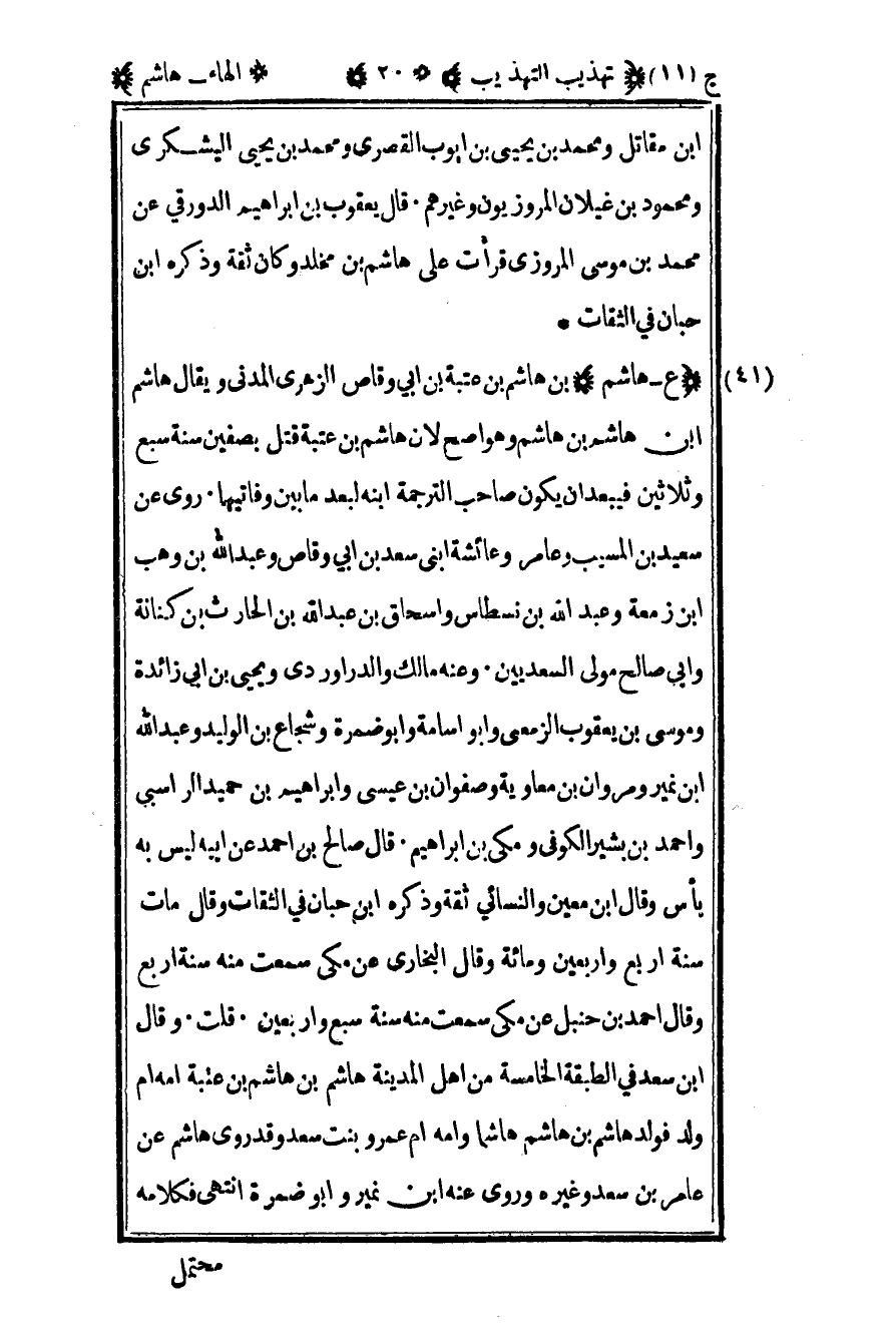 41- "ع – هاشم" ابن هاشم بن عتبة بن أبي وقاص الزهري المدني ويقال هاشم بن هاشم بن هاشم وهو أصح لأن هاشم بن عتبة قتل بصفين سنة سبع وثلاثين فيبعد أن يكون صاحب الترجمة ابنه لبعد ما بين وفاتيهما روى عن سعيد بن المسيب وعامر وعائشة ابني سعد بن أبي وقاص وعبد الله بن وهب بن زمعة وعبد الله بن نسطاس وإسحاق بن عبد الله بن الحارث بن كنانة وأبي صالح مولى السعديين وعنه مالك والداروردي ويحيى بن أبي زائدة وموسى بن يعقوب الزمعي وأبو أسامة وأبو ضمرة وشجاع بن الوليد وعبد الله بن نمير ومروان بن معاوية وصفوان بن عيسى وإبراهيم بن حميد الراسبي وأحمد بن بشير الكوفي ومكي بن إبراهيم قال صالح بن أحمد عن أبيه: ليس به بأس وقال بن معين والنسائي ثقة ذكره بن حبان في الثقات وقال مات سنة أربع وأربعين ومائة وقال البخاري: عن مكي سمعت منه سنة أربع وقال أحمد بن حنبل عن مكي سمعت منه سنة سبع وأربعين قلت: وقال بن سعد في الطبقة الخامسة من أهل المدينة هاشم بن هاشم بن عتبة أمه أم ولد فولد هاشم بن هاشم هاشما وأمه أم عمرو بنت سعد وقد روى هاشم عن عامر بن سعد وغيره وروى عنه بن نمير وأبو ضمرة انتهى فكلامه