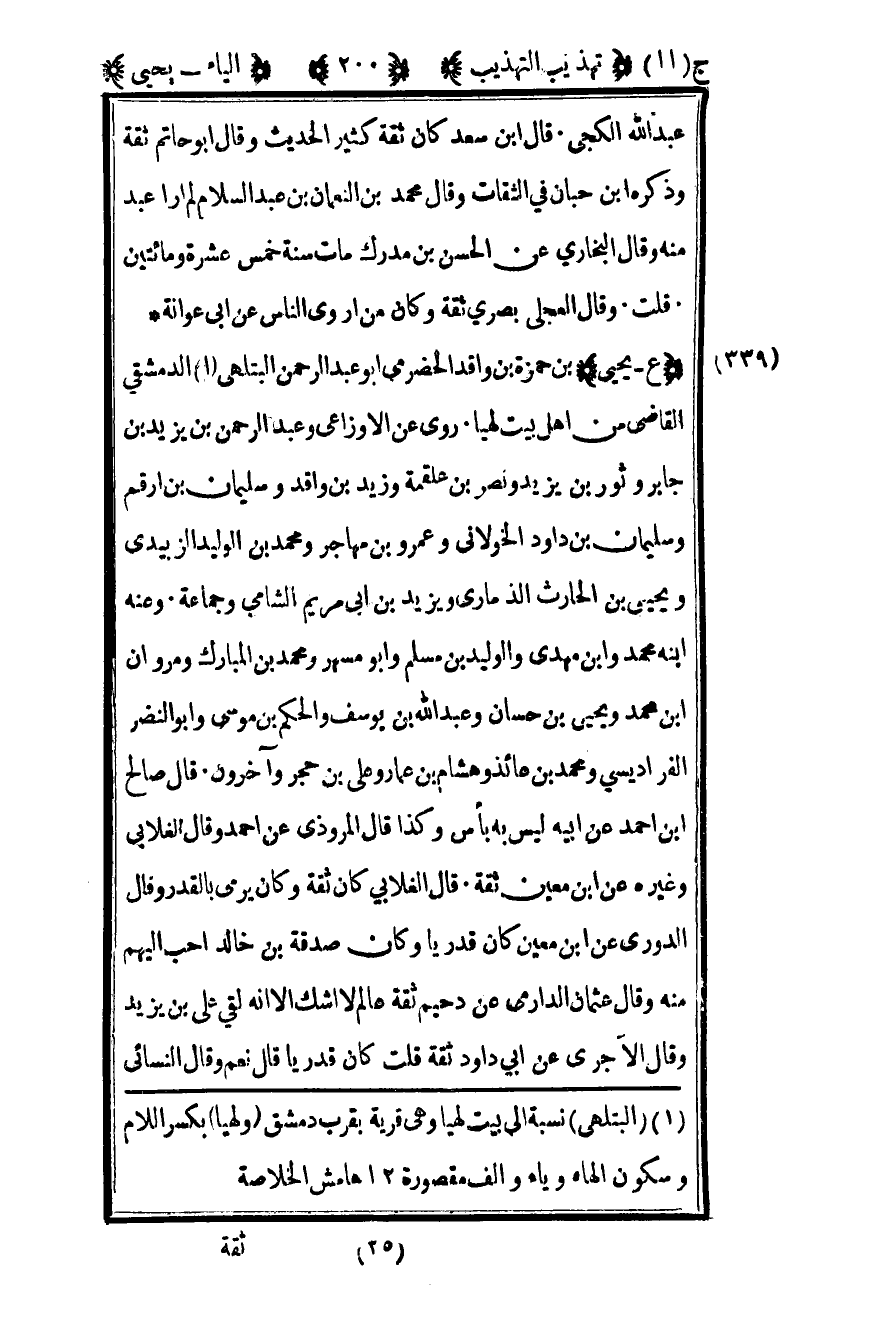339 – "ع – يحيى" بن حمزة بن واقد الحضرمي أبو عبد الرحمن البتلهي1 الدمشقي القاضي من أهل بيت لهيا روى عن الأوزاعي وعبد الرحمن بن يزيد بن جابر وثور بن يزيد ونصر بن علقمة وزيد بن واقد وسليمان بن أرقم وسليمان بن داود الخولاني وعمرو بن مهاجر ومحمد بن الوليد الزبيدي ويحيى بن الحارث الذماري ويزيد بن أبي مريم الشامي وجماعة وعنه ابنه محمد وابن مهدي والوليد بن مسلم وأبو مسهر ومحمد بن المبارك ومروان بن محمد ويحيى بن حسان وعبد الله بن يوسف والحكم بن موسى وأبو النضر الفراديسي ومحمد بن عائذ وهشام بن عمار وعلي بن حجر وآخرون قال صالح بن أحمد عن أبيه: ليس به بأس وكذا قال المروذي عن أحمد وقال الغلابي وغيره عن بن معين ثقة قال الغلابي كان ثقة وكان يرمي بالقدر وقال الدوري عن بن معين كان قدريا وكان صدقة بن خالد أحب إليهم منه وقال عثمان الدارمي عن دحيم: ثقة عالم لا أشك إلا أنه لقي علي بن يزيد وقال الآجري عن أبي داود ثقة قلت: كان قدريا قال نعم وقال النسائي