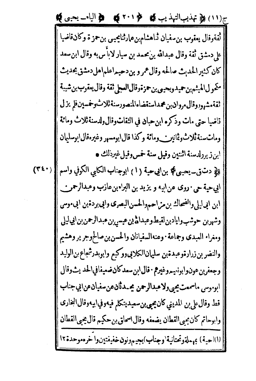 340 – "د ت ق – يحيى" بن أبي حية1 أبو جناب الكلبي الكوفي واسم أبي حية حي روى عن أبيه ويزيد بن البراء بن عازب وعبد الرحمن بن أبي ليلى والضحاك بن مزاحم والحسن البصري وأبي بردة بن أبي موسى وشهر بن حوشب وإياد بن لقيط وعبد الله بن عيسى بن عبد الرحمن بن أبي ليلى ومغراء العبدي وجماعة وعنه السفيانان والحسن بن صالح وجرير وهشيم والنضر بن زرارة وعبدة بن سليمان الكلابي ووكيع وأبو بدر شجاع بن الوليد وجعفر بن عون وأبو نعيم وغيرهم قال بن سعد كان ضعيفا في الحديث وقال أبو موسى ما سمعت يحيى ولا عبد الرحمن يحدثان عن سفيان عن أبي جناب قط وقال علي بن المديني كان يحيى بن سعيد يتكلم فيه وفي أبيه وقال البخاري: وأبو حاتم كان يحيى القطان يضعفه وقال إسحاق بن حكيم قال يحيى القطان