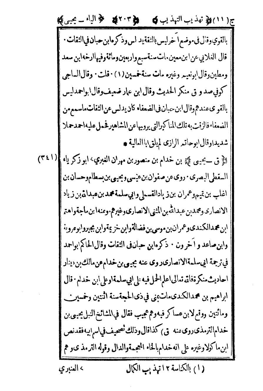341 – "ق – يحيى" بن خدام بن منصور بن مهران الغبري2 أبو زكريا السقطي البصري روى عن صفوان بن عيسى ويحيى بن بسطام وحسان بن أغلب بن تميم وعمران بن زياد القسملي وأبي سلمة محمد بن عبد الله بن زياد الأنصاري ومحمد بن عبد الله بن المثنى الأنصاري وغيرهم وعنه بن ماجة واهتم بن محمد الكندي وعمران بن موسى بن فضالة وابن خزيمة وابن بجير وأبو عروبة وابن صاعد وآخرون ذكره بن حبان في الثقات وقال الحاكم أبو أحمد في ترجمة أبي سلمة الأنصاري روى عنه يحيى بن خدام عن مالك بن دينار أحاديث منكرة فالله تعالى أعلم الحمل فيه على أبي سلمة أو على بن خدام قال إبراهيم بن محمد الكندي مات بمنى في ذي الحجة سنة اثنتين وخمسين ومائتين ووقع لابن عساكر فيه وهم عجيب فقال في المشائخ النبل يحيى بن خدام الترمذي روى عنه ق كذا قال وذلك تصحيف في اسم أبيه فقد نص بن ماكولا وغيره على أنه خدام بالخاء المعجمة والدال وقوله الترمذي وهم