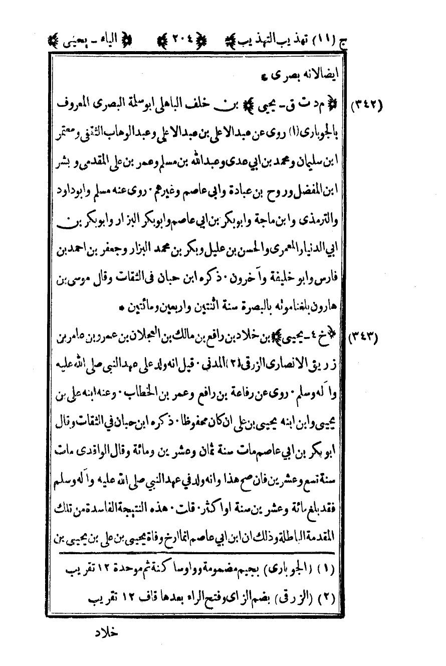 342 – "م د ت ق – يحيى" بن خلف الباهلي أبو سلمة البصري المعروف بالجوباري1 روى عن عبد الأعلى بن عبد الأعلى وعبد الوهاب الثقفي ومعتمر بن سليمان ومحمد بن أبي عدي وعبد الله بن مسلم وعمر بن علي المقدمي وبشر بن المفضل وروح بن عبادة وأبي عاصم وغيرهم روى عنه مسلم وأبو داود والترمذي وابن ماجة وأبو بكر بن أبي عاصم وأبو بكر البزار وأبو بكر بن أبي الدنيا والمعمري والحسن بن عليل وبكر بن محمد البزار وجعفر بن أحمد بن فارس وأبو خليفة وآخرون ذكره بن حبان في الثقات وقال موسى بن هارون بلغنا موته بالبصرة سنة اثنتين وأربعين ومائتين.