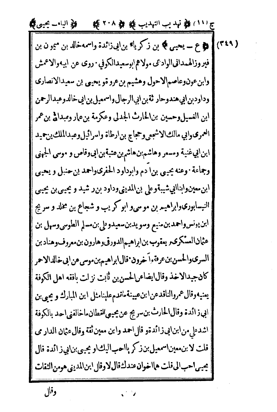 350 – "ع – يحيى" بن زكريا بن أبي زائدة واسمه خالد بن ميمون بن فيروز الهمداني الوادعي مولاهم أبو سعيد الكوفي روى عن أبيه والأعمش وابن عون وعاصم الأحول وهشيم بن عروة ويحيى بن سعيد الأنصاري وداود بن أبي هند وحارثة بن أبي الرجال وإسماعيل بن أبي خالد وعبد الرحمن بن الغسيل وحسين بن الحارث الجدلي وعكرمة بن عمار وعبد الله بن عمر العمري وأبي مالك الأشجعي وحجاج بن أرطاة وإسرائيل وعبد الملك بن حميد بن أبي غنية ومسعر وهاشم بن هاشم بن عتبة بن أبي وقاص وموسى الجهني وجماعة وعنه يحيى بن آدم وأبو داود الحفري وأحمد بن حنبل ويحيى بن معين وابنا أبي شيبة وعلي بن المديني وداود بن رشيد ويحيى بن يحيى النيسابوري وإبراهيم بن موسى وأبو كريب وشجاع بن مخلد وسريج بن يونس وأحمد بن منيع وسويد بن سعيد وعلي بن مسلم الطوسي وسهيل بن عثمان العسكري ويعقوب بن إبراهيم الدورقي وهارون بن معروف وهناد بن السري والحسن بن عرفة وآخرون قال إبراهيم بن موسى عن أبي خالد الأحمر كان جيد الأخذ وقال أيضا عن الحسن بن ثابت نزلت بأفقه أهل الكوفة يعنيه وقال عمرو الناقد عن بن عيينة ما قدم علينا مثل بن المبارك ويحيى بن أبي زائدة وقال الحارث بن سريج عن يحيى القطان ما خالفني أحد بالكوفة أشد علي من بن أبي زائدة وقال أحمد وابن معين ثقة وقال عثمان الدارمي قلت لابن معين: إسماعيل بن زكريا أحب إليك أو يحيى بن أبي زائدة قال يحيى أحب إلي قلت: هما إخوان عندك قال لا وقال بن المديني هو من الثقات