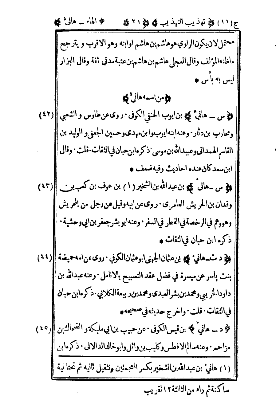 1 هانئ بن عبد الله بن الشخير بكسر المعجمتين وتثقيل ثانيه ثم تحتانية ساكنة راء من الثالثة 12 تقريب.