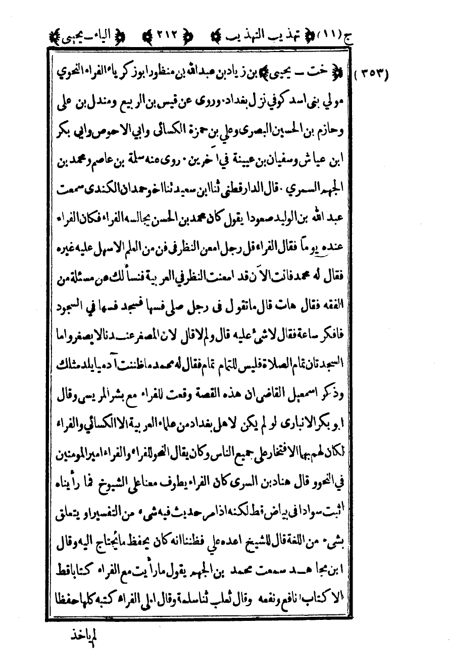 345-"خت – يحيى" بن زياد بن عبد الله بن منظور أبو زكريا الفراء النحوي مولى بني أسد كوفي نزل بغداد وروى عن قيس بن الربيع ومندل بن علي وحازم بن الحسين البصري وعلي بن حمزة الكسائي وأبي الأحوص وأبي بكر بن عياش وسفيان بن عيينة في آخرين روى عنه سلمة بن عاصم ومحمد بن الجهم السمري قال الدارقطني: ثنا بن سعيد ثنا أخو حمدان الكندي سمعت عبد الله بن الوليد صعودا يقول كان محمد بن الحسن يجالسه الفراء عنده يوما فقال الفراء قل رجل أمعن في فن من العلم إلا سهل عليه غيره فقال له محمد فأنت الآن قد امعنت النظر في العربية فنسألك عن مسألة من الفقه فقال هات قال ما تقول في رجل صلى فسها فسجد فسها في السجود فافكر ساعة فقال لا شيء عليه قال ولم لا قال لأن المصغر عندنا لا يصغر واما السجدتان تمام الصلاة فليس لتمام تمام فقال له محمد ما ظننت آدميا يلد مثلك وذكر إسماعيل القاضي أن هذه القصة وقعت للفراء مع بشر المريسي وقال أبو بكر الأنباري لو لم يكن لأهل بغداد من علماء العربية إلا الكسائي والفراء لكان لهم بهما الافتخار على جميع الناس وكان يقال النحو للفراء والفراء أمير المؤمنين في النحو وقال هناد بن السري كان الفراء يطوف معنا على الشيوخ فما رأيناه أثبت سوادا في بياض قط لكنه إذا مر حديث فيه شيء من التفسير أو يتعلق بشيء من اللغة قال للشيخ أعده علي فظننا أنه كان يحفظ ما يحتاج إليه وقال بن مجاهد سمعت محمد بن الجهم يقول ما رأيت مع الفراء كتابا قط إلا كتاب نافع ونفعه وقال ثعلب ثنا سلمة وقال لعلي الفراء كتبه كلها حفظا