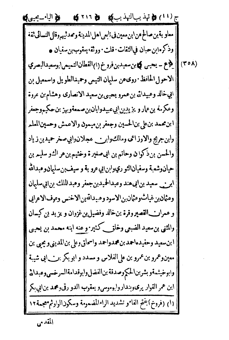 359 – "ع – يحيى" بن سعيد بن فروخ1 القطان التميمي أبو سعيد البصري الأحول الحافظ روى عن سليمان التيمي وحميد الطويل وإسماعيل بن أبي خالد وعبيد الله بن عمر ويحيى بن سعيد الأنصاري وهشام بن عروة وعكرمة بن عمار ويزيد بن أبي عبيد وأبان بن صمعة وبهز بن حكيم وجعفر بن محمد بن علي بن الحسين وجعفر بن ميمون والأعمش وحسين المعلم وابن جريج والأوزاعي ومالك وابن عجلان وأبي صخر حميد بن زياد والحسن بن ذكوان وحاتم بن أبي صغيرة وخثيم بن عراك وسليم بن حيان وشعبة وسفيان الثوري وابن أبي عروبة وسيف بن سليمان وعبد الله بن سعيد بن أبي هند وعبد الحميد بن جعفر وعبد الملك بن أبي سليمان وعثمان بن غياث وعثمان بن الأسود وعبيد الله بن الأخنس وعوف الأعرابي وعمران القصير وقرة بن خالد وفضيل بن غزوان ويزيد بن كيسان والمثنى بن سعيد الضبعي وخلق كثير وعنه ابنه محمد بن يحيى بن سعيد وحفيده أحمد بن محمد وأحمد وإسحاق وعلي بن المديني ويحيى بن معين وعمرو بن علي الفلاس ومسدد وأبو بكر بن أبي شيبة وأبو خيثمة وبشر بن الحكم وصدقة بن الفضل وأبو قدامة السرخسي وعبد الله بن عمر القواريري وبندار وأبو موسى ويعقوب الدورقي ومحمد بن أبي بكر