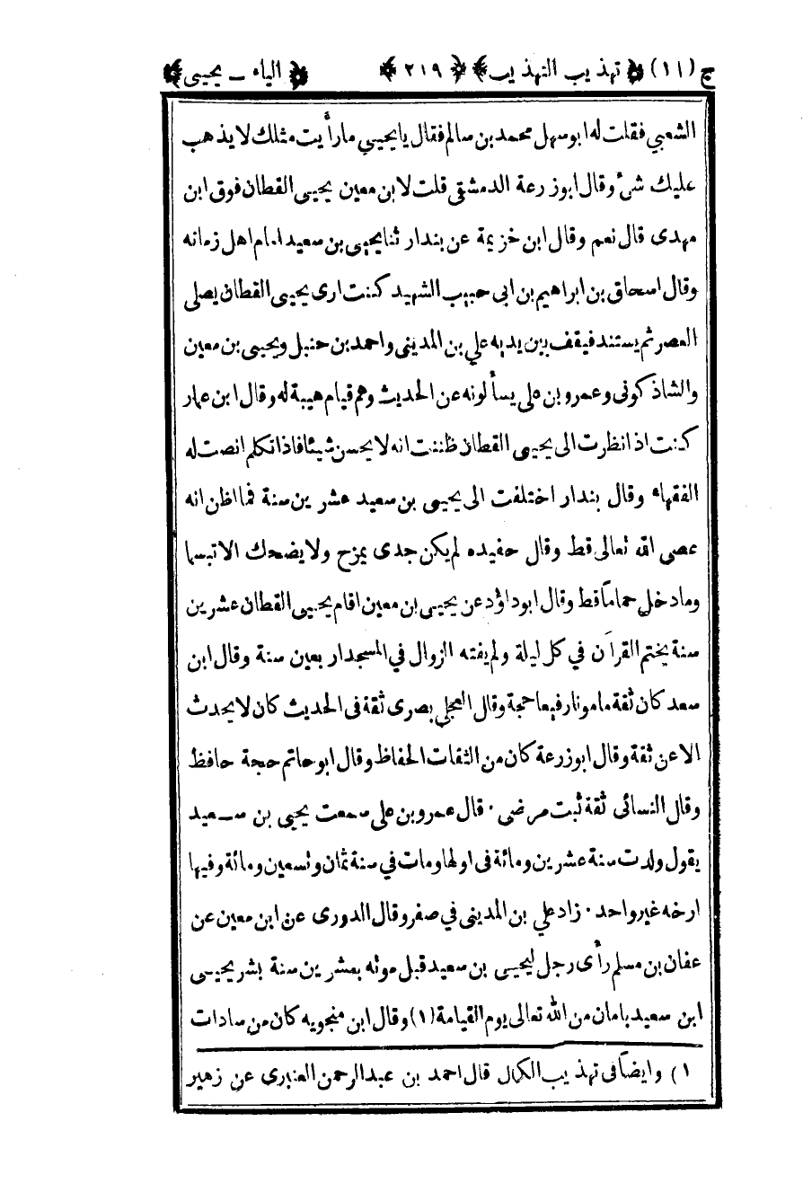 الشعبي فقلت له: أبو سهل محمد بن سالم فقال يا يحيى ما رأيت مثلك لا يذهب عليك شيء وقال أبو زرعة الدمشقي قلت لابن معين: يحيى القطان فوق بن مهدي قال نعم وقال بن خزيمة عن بندار ثنا يحيى بن سعيد إمام أهل زمانه وقال إسحاق بن إبراهيم بن أبي حبيب الشهيد كنت أرى يحيى القطان يصلي العصر ثم يستند فيقف بين يديه علي بن المديني وأحمد بن حنبل ويحيى بن معين والشاذكوني وعمرو بن علي يسألونه عن الحديث وهم قيام هيبة له وقال بن عمار كنت إذا نظرت إلى يحيى القطان ظننت أنه لا يحسن شيئا فإذا تكلم أنصت له الفقهاء وقال بندار اختلفت إلى يحيى بن سعيد عشرين سنة فما أظن أنه عصى الله تعالى قط وقال حفيده لم يكن جدي يمزح ولا يضحك إلا تبسما وما دخل حماما قط وقال أبو داود عن يحيى بن معين أقام يحيى القطان عشرين سنة يختم القرآن في كل ليلة ولم يفته الزوال في المسجد أربعين سنة وقال بن سعد كان ثقة مأمونا رفيعا حجة وقال العجلي بصري ثقة في الحديث كان لا يحدث إلا عن ثقة وقال أبو زرعة كان من الثقات الحفاظ وقال أبو حاتم: حجة حافظ وقال النسائي: ثقة ثبت مرضي قال عمرو بن علي سمعت يحيى بن سعيد يقول ولدت سنة عشرين ومائة في أولها ومات في سنة ثمان وتسعين ومائة وفيها أرخه غير واحد زاد علي بن المديني في صفر وقال الدوري عن بن معين عن عفان بن مسلم رأى رجل ليحيى بن سعيد قبل موته بعشرين سنة بشر يحيى بن سعيد بأمان من الله تعالى يوم القيامة1 وقال بن منجويه كان من سادات