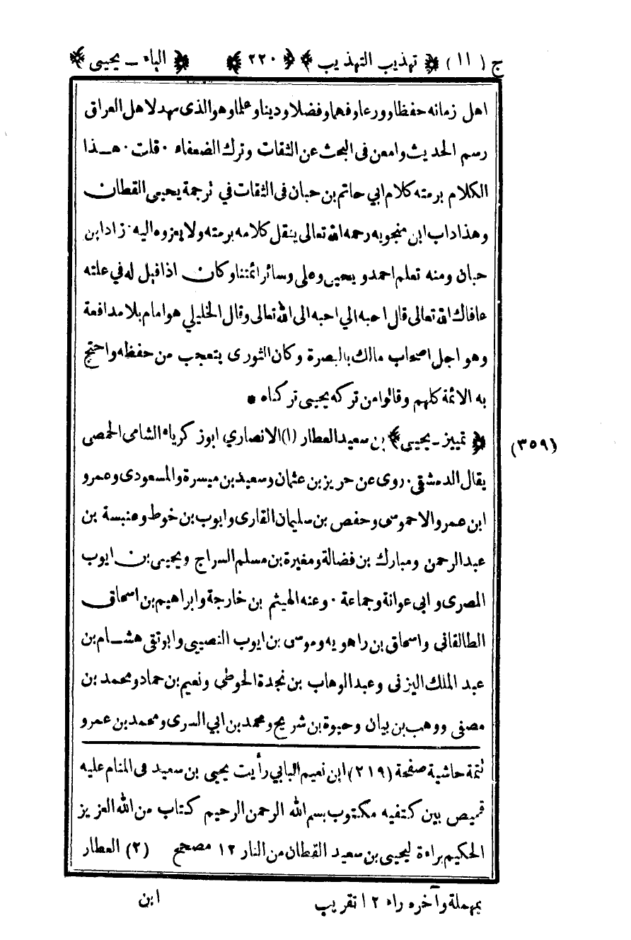 360 – "تمييز يحيى" بن سعيد العطار1 الأنصاري أبو زكريا الشامي الحمصي يقال الدمشقي روى عن حريز بن عثمان وسعيد بن ميسرة والمسعودي وعمرو بن عمرو الأحموسي وحفص بن سليمان القاري وأيوب بن خوط وعنبسة بن عبد الرحمن ومبارك بن فضالة ومغيرة بن مسلم السراج ويحيى بن أيوب المصري وأبي عوانة وجماعة وعنه الهيثم بن خارجة وإبراهيم بن إسحاق الطالقاني وإسحاق بن راهويه وموسى بن أيوب النصيبي وأبو تقي هشام بن عبد الملك اليزني وعبد الوهاب بن نجدة الحوطي ونعيم بن حماد ومحمد بن مصفى ووهب بن بيان وحيوة بن شريح ومحمد بن أبي السري ومحمد بن عمرو