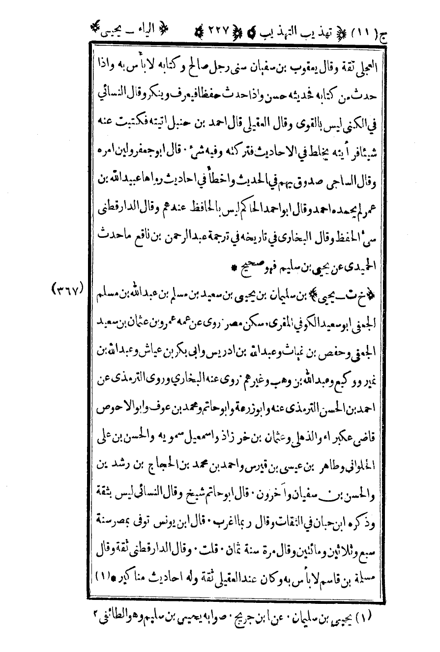 368 – "خ ت – يحيى" بن سليمان بن يحيى بن سعيد بن مسلم بن عبد الله بن مسلم الجعفي أبو سعيد الكوفي المقري سكن مصر روى عن عمه عمرو بن عثمان بن سعيد الجعفي وحفص بن غياث وعبد الله بن إدريس وأبي بكر بن عياش وعبد الله بن نمير ووكيع وعبد الله بن وهب وغيرهم روى عنه البخاري وروى الترمذي عن أحمد بن الحسن الترمذي عنه وأبو زرعة وأبو حاتم ومحمد بن عوف وأبو الأحوص قاضي عكبراء والذهلي وعثمان بن خرزاذ وإسماعيل سمويه والحسن بن علي الحلواني وطاهر بن عيسى بن قيرس وأحمد بن محمد بن الحجاج بن رشدين والحسن بن سفيان وآخرون قال أبو حاتم: شيخ وقال النسائي: ليس بثقة وذكره بن حبان في الثقات وقال ربما أغرب قال بن يونس توفي بمصر سنة سبع وثلاثين ومائتين وقال مرة سنة ثمان قلت: وقال الدارقطني: ثقة وقال مسلمة بن قاسم لا بأس به وكان عند العقيلي ثقة وله أحاديث مناكير1.