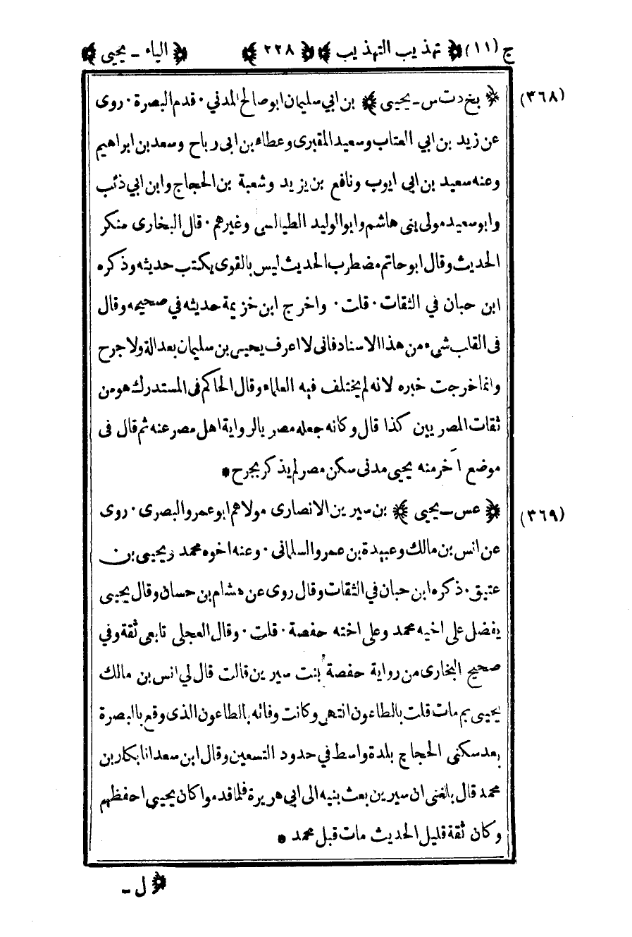 370 – "عس – يحيى" بن سيرين الأنصاري مولاهم أبو عمرو البصري روى عن أنس بن مالك وعبيدة بن عمرو السلماني وعنه أخوه محمد ويحيى بن عتيق ذكره بن حبان في الثقات وقال روى عن هشام بن حسان وقال يحيى يفضل على أخيه محمد وعلى أخته حفصة قلت: وقال العجلي تابعي ثقة وفي صحيح البخاري من رواية حفصة بنت سيرين قالت قال لي أنس بن مالك يحيى بم مات قلت: بالطاعون انتهى وكانت وفاته بالطاعون الذي وقع بالبصرة بعد سكنى الحجاج بلدة واسط في حدود التسعين وقال بن سعد أنا بكار بن محمد قال بلغني أن سيرين بعث بنية إلى أبي هريرة فلما قدموا كان يحيى أحفظهم وكان ثقة قليل الحديث مات قبل محمد.