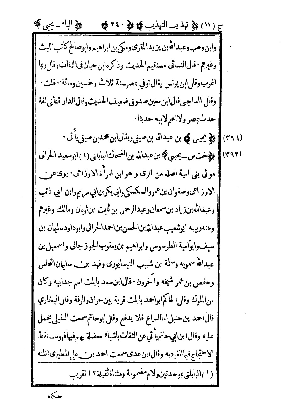 393- "خت س – يحيى" بن عبد الله بن الضحاك البابلتي1 أبو سعيد الحراني مولى بني أمية أصله من الري وهو بن امرأة الأوزاعي روى عن الأوزاعي وصفوان بن عمرو السكسكي وأبي بكر بن أبي مريم وابن أبي ذئب وعبد الله بن زياد بن سمعان وعبد الرحمن بن ثابت بن ثوبان ومالك وغيرهم وعنه ربيبه أبو شعيب عبد الله بن الحسن بن أحمد الحراني وأبو داود سليمان بن سيف وأبو أمية الطرسوسي وإبراهيم بن يعقوب الجوزجاني وإسماعيل بن عبد الله سمويه وسلمة بن شبيب النيسابوري وفهد بن سليمان النحاس وحفص بن عمر شيخه وآخرون قال بن سعد بابلت اسم جد أبيه وكان من الملوك وقال الحاكم أبو أحمد بابلت قرية بين حران والرقة وقال البخاري: قال أحمد بن حنبل أما السماع فلا يدفع وقال أبو حاتم: سمعت النفيلي يحمل عليه وقال بن أبي حاتم يأتي عن الثقات بأشياء معضلة بهم فيها فهو ساقط الاحتجاج فيما انفرد به وقال بن عدي سمعت أحمد بن علي المطيري أظنه