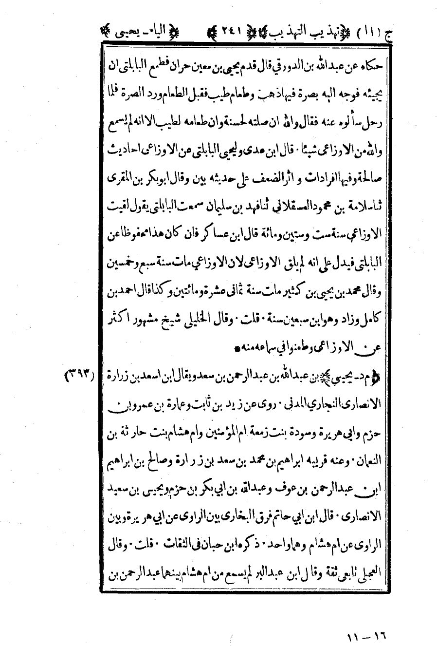 394 – "م د – يحيى" بن عبد الله بن عبد الرحمن بن سعد ويقال بن أسعد بن زرارة الأنصاري النجاري المدني روى عن زيد بن ثابت وعمارة بن حزم وأبي هريرة وسودة بنت زمعة أم المؤمنين وأم هشام بنت حارثة بن النعمان وعنه قريبه إبراهيم بن محمد بن سعد بن زرارة وصالح بن إبراهيم بن عبد الرحمن بن عوف وعبد الله بن أبي بكر بن حزم ويحيى بن سعيد الأنصاري قال بن أبي حاتم فرق البخاري بين الراوي عن أبي هريرة وبين الراوي عن أم هشام وهما واحد ذكره بن حبان في الثقات قلت: وقال العجلي تابعي ثقة وقال بن عبد البر لم يسمع من أم هشام بينهما عبد الرحمن بن