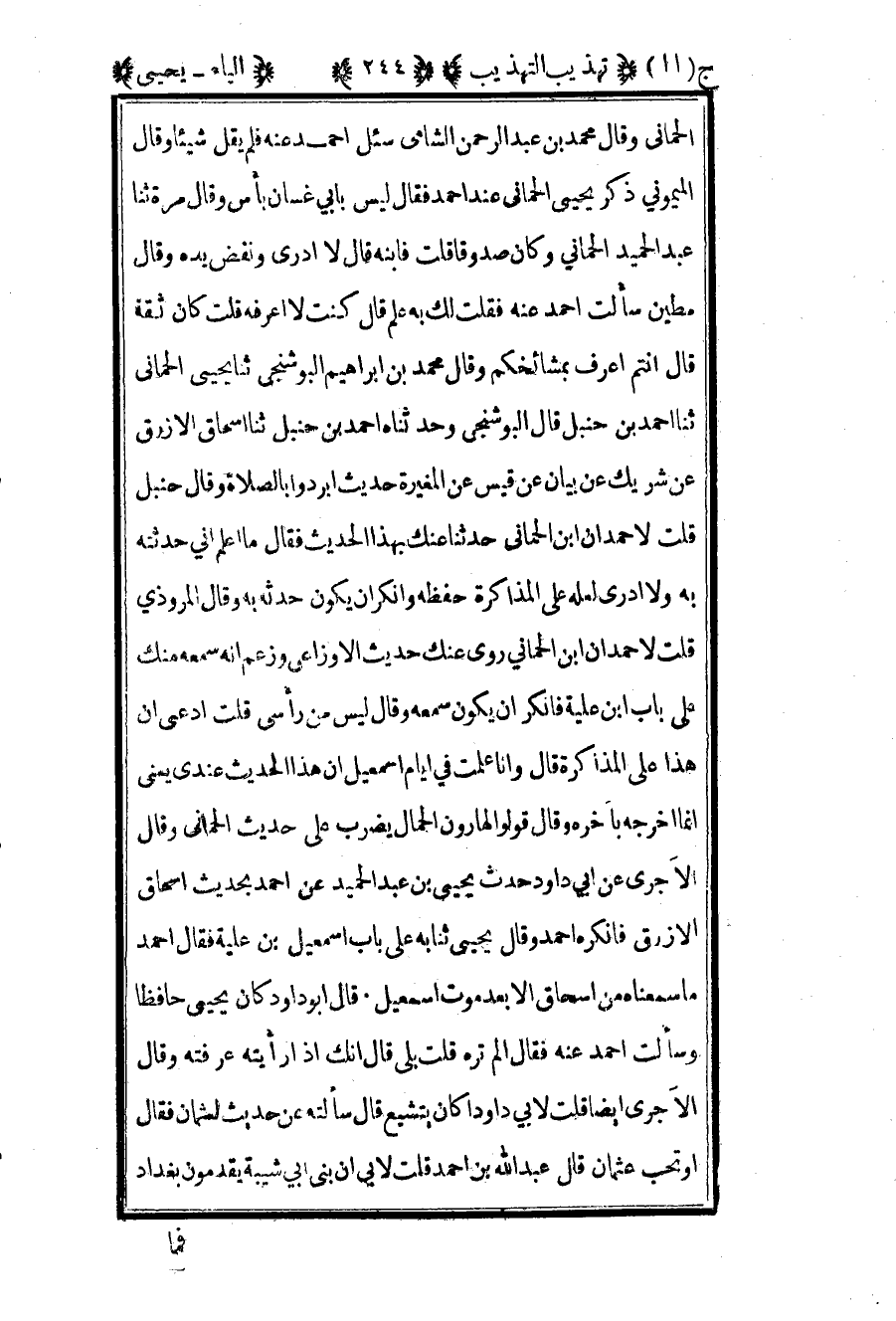 الحماني وقال محمد بن عبد الرحمن الشامي سئل أحمد عنه فلم يقل شيئا وقال الميموني ذكر يحيى الحماني عند أحمد فقال: ليس بأبي غسان بأس وقال مرة ثنا عبد الحميد الحماني وكان صدوقا قلت: فابنه قال لا أدري ونفض يده وقال مطين سألت أحمد عنه فقلت: لك به علم قال كنت لا أعرفه قلت: كان ثقة قال أنتم أعرف بمشائخكم وقال محمد بن إبراهيم البوشنجي ثنا يحيى الحماني ثنا أحمد بن حنبل قال البوشنجي وحدثناه أحمد بن حنبل ثنا إسحاق الأزرق عن شريك عن بيان عن قيس عن المغيرة حديث أبردوا بالصلاة وقال حنبل قلت: لأحمد: إن بن الحماني حدثنا عنك بهذا الحديث قال ما أعلم أني حدثته به ولا أدري لعله على المذاكرة حفظه وأنكر أن يكون حدثه به وقال المروذي قلت: لأحمد: أن بن الحماني روى عنك حديث الأوزاعي وزعم أنه سمعه منك على باب بن علية فأنكر أن يكون سمعه وقال: ليس من رأسي قلت: ادعى أن هذا على المذاكرة قال وأنا علمت في أيام إسماعيل أن هذا الحديث عندي يعني إنما أخرجه بآخره وقال قولوا لهارون الحمال يضرب على حديث الحماني وقال الآجري عن أبي داود حدث يحيى بن عبد الحميد عن أحمد بحديث إسحاق الأزرق فأنكره أحمد وقال يحيى ثنا به على باب إسماعيل بن علية فقال أحمد ما سمعناه من إسحاق إلا بعد موت إسماعيل قال أبو داود كان يحيى حافظا وسألت أحمد عنه فقال ألم تره قلت: بلى قال انك إذا رأيته عرفته وقال الآجري أيضا قلت لأبي داود: أكان يتشيع قال سألته عن حديث لعثمان فقال أو تحب عثمان قال عبد الله بن أحمد قلت لأبي: أن بني أبي شيبة يقدمون بغداد