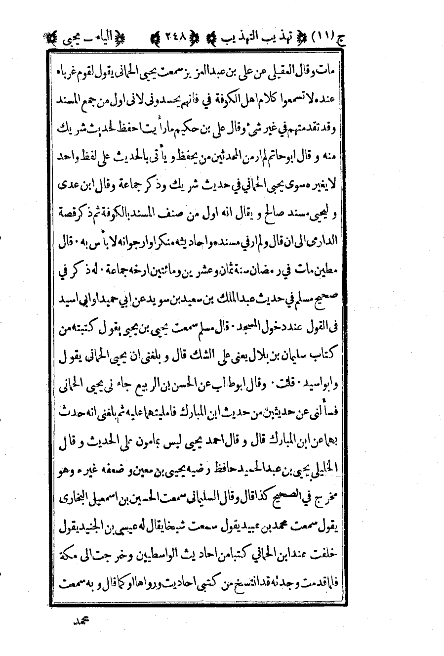 مات وقال العقيلي عن علي بن عبد العزيز سمعت يحيى الحماني يقول لقوم غرباء عنده لا تسمعوا كلام أهل الكوفة في فإنهم يحسدوني لأني أول من جمع المسند وقد تقدمتهم في غير شيء وقال علي بن حكيم ما رأيت أحفظ لحديث شريك منه وقال أبو حاتم: لم أر من المحدثين من يحفظ ويأتي بالحديث على لفظ واحد لا يغيره سوى يحيى الحماني في حديث شريك وذكر جماعة وقال بن عدي وليحيى مسند صالح ويقال إنه أول من صنف المسند بالكوفة ثم ذكر قصة الدارمي إلى أن قال ولم أر في مسنده وأحاديثه منكرا وأرجو أنه لا بأس به قال مطين مات في رمضان سنة ثمان وعشرين ومائتين أرخه جماعة له ذكر في صحيح مسلم في حديث عبد الملك بن سعيد بن سويد عن أبي حميد أو أبي أسيد في القول عند دخول المسجد قال مسلم سمعت يحيى بن يحيى يقول كتبته من كتاب سليمان بن بلال يعني على الشك قال وبلغني أن يحيى الحماني يقول وأبو أسيد قلت: وقال أبو طالب عن الحسن بن الربيع جاءني يحيى الحماني فسألني عن حديثين من حديث بن المبارك فأمليتهما عليه ثم بلغني أنه حدث بهما عن بن المبارك قال وقال أحمد يحيى: ليس بمأمون على الحديث وقال الخليلي يحيى بن عبد الحميد حافظ رضيه يحيى بن معين وضعفه غيره وهو مخرج في الصحيح كذا قال وقال السليماني سمعت الحسين بن إسماعيل البخاري يقول سمعت محمد بن عبيد يقول سمعت شيخا يقال له عيسى بن الجنيد يقول خلفت عند بن الحماني كتبا من أحاديث الواسطيين وخرجت إلى مكة فلما قدمت وجدته قد انتسخ من كتبي أحاديث ورواها أو كما قال وبه سمعت