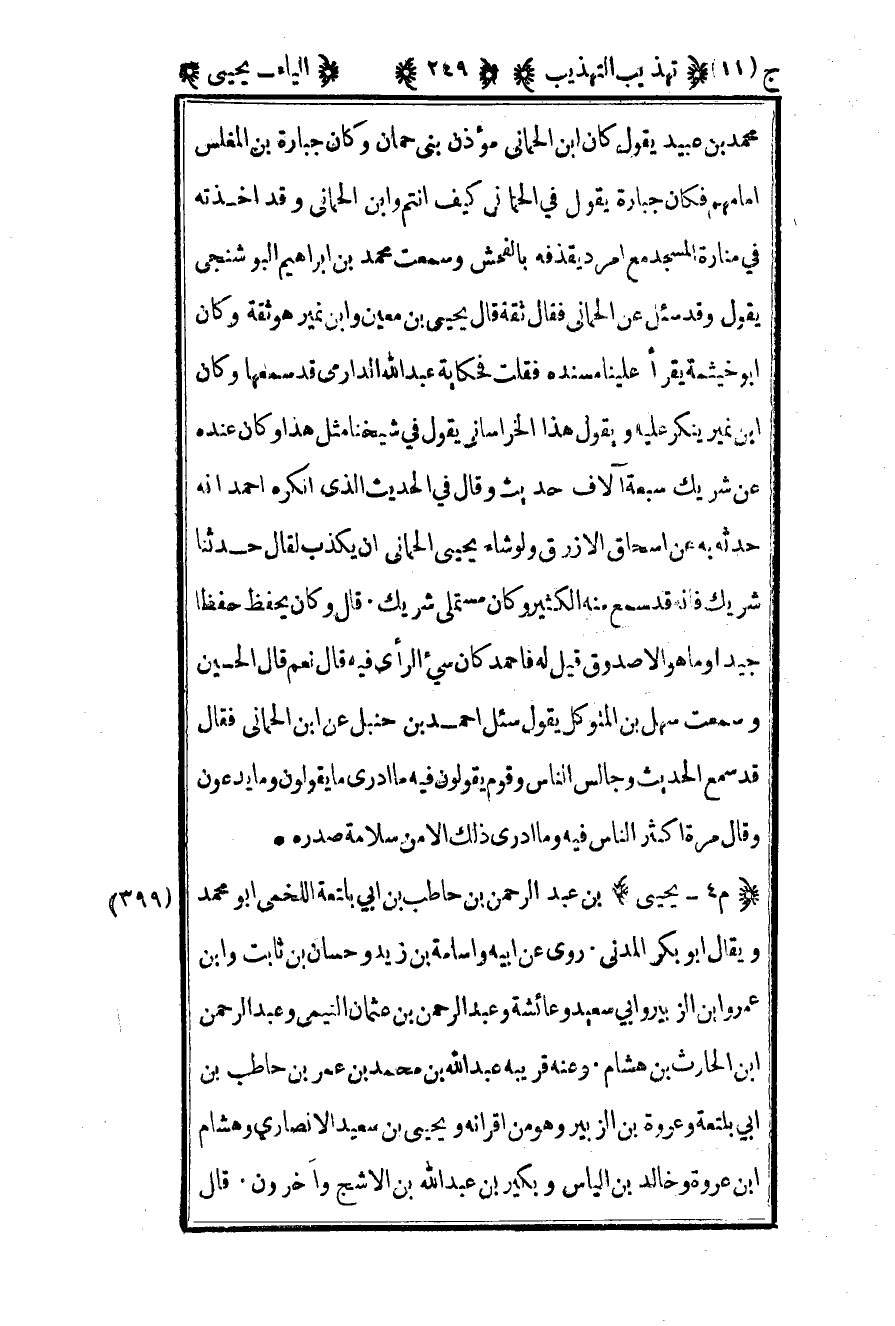 400 – "م 4 – يحيى" بن عبد الرحمن بن حاطب بن أبي بلتعة اللخمي أبو محمد ويقال أبو بكر المدني روى عن أبيه وأسامة بن زيد وحسان بن ثابت وابن عمر وابن الزبير وأبي سعيد وعائشة وعبد الرحمن بن عثمان التيمي وعبد الرحمن بن الحارث بن هشام وعنه قريبه عبد الله بن محمد بن عمر بن حاطب بن أبي بلتعة وعروة بن الزبير وهو من أقرانه ويحيى بن سعيد الأنصاري وهشام بن عروة وخالد بن إلياس وبكير بن عبد الله بن الأشج وآخرون قال