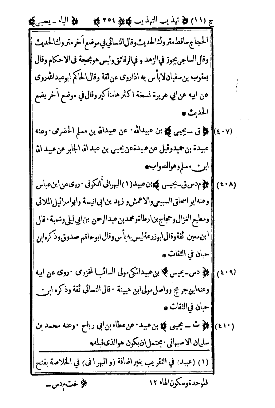 408 – "ق – يحيى" بن عبيد الله عن عبيد الله بن مسلم الحضرمي وعنه عبيدة بن حميد وقيل عن عبيدة عن يحيى بن عبد الله الجابر عن عبيد الله بن مسلم وهو الصواب.
