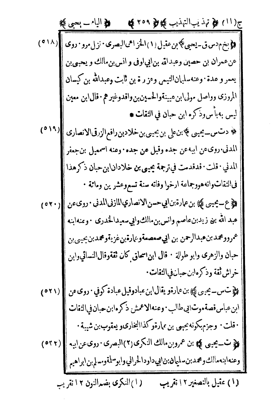 419-"بخ م د س ق – يحيى" بن عقيل1 الخزاعي البصري نزل مرو روى عن عمرو أن بن حصين وعبد الله بن أبي أوفى وأنس بن مالك ويحيى بن يعمر وعدة وعنه سليمان التيمي وعزرة بن ثابت وعبد الله بن كيسان المروزي وواصل مولى بن عيينة والحسين بن واقد وغيرهم قال بن معين: ليس به بأس وذكره بن حبان في الثقات.