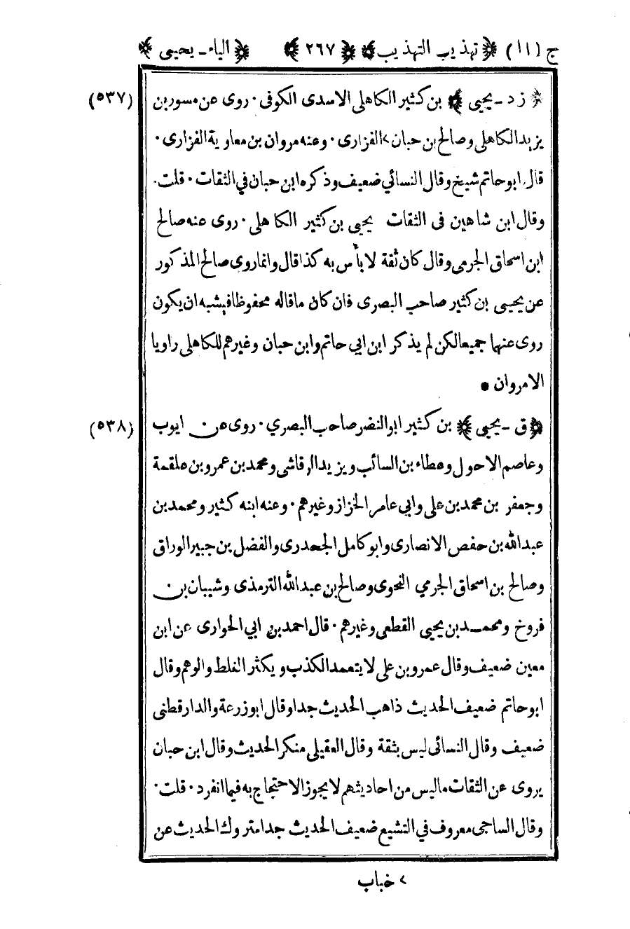 438 – "ز د – يحيى" بن كثير الكاهلي الأسدي الكوفي روى عن مسور بن يزيد الكاهلي وصالح بن حبان الفزاري وعنه مروان بن معاوية الفزاري قال أبو حاتم: شيخ وقال النسائي: ضعيف وذكره بن حبان في الثقات قلت: وقال بن شاهين في الثقات يحيى بن كثير الكاهلي روى عنه صالح بن إسحاق الجرمي وقال كان ثقة لا بأس به كذا قال وإنما روى صالح المذكور عن يحيى بن كثير صاحب البصري فإن كان ما قاله محفوظا فيشبه أن يكون روى عنهما جميعا لكن لم يذكر بن أبي حاتم وابن حبان وغيرهم للكاهلي راويا إلا مروان.