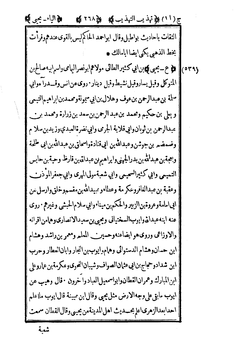 440 – "ع – يحيى" بن أبي كثير الطائي مولاهم أبو نصر اليمامي واسم أبيه صالح بن المتوكل وقيل يسار وقيل نشيط وقيل دينار روى عن أنس وقد رآه وأبي سلمة بن عبد الرحمن بن عوف وهلال بن أبي ميمونة ومحمد بن إبراهيم التيمي ويعلى بن حكيم ومحمد بن عبد الرحمن بن سعد بن زرارة ومحمد بن عبد الرحمن بن ثوبان وأبي قلابة الجرمي وأبي نضرة العبدي وزيد بن سلام وضمضم بن جوشن وعبد الله بن أبي قتادة وإسحاق بن عبد الله بن أبي طلحة وبعجة بن عبد الله بن بدر الجهني وإبراهيم بن عبد الله بن قارظ وحية بن حابس التميمي وأبي كثير السحيمي وأبي شعبة مولى المهري وأبي جعفر المؤذن وعقبة بن عبد الغافر وعكرمة وعطاء وعبيد الله بن مقسم وخلق وأرسل عن أبي أمامة وعروة بن الزبير والحكم بن ميناء وأبي سلام الحبشي وغيرهم روى عنه ابنه عبد الله وأيوب السختياني ويحيى بن سعيد الأنصاري وهما من أقرانه والأوزاعي وروى هو أيضا عنه وحسين المعلم ومعمر بن راشد وهشام بن حسان وهشام الدستوائي وهمام وأيوب بن النجار وأبان العطار وحرب بن شداد وحجاج بن أبي عثمان الصواف وشيبان النحوي وعكرمة بن عمار وعلي بن المبارك وعمران القطان وأبو إسماعيل العباد وآخرون قال وهيب عن أيوب ما بقي على وجه الأرض مثل يحيى وقال بن عيينة قال أيوب ما أعلم أحدا بعد الزهري أعلم بحديث أهل المدينة من يحيى وقال القطان سمعت