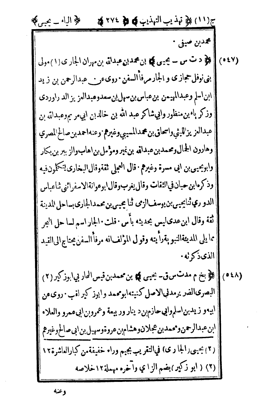 449- "بخ مد ت س ق – يحيى" بن محمد بن قيس المحاربي أبو زكير2 البصري الضرير مدني الأصل كنيته أبو محمد وأبو زكير لقب روى عن أبيه وزيد بن أسلم وأبي حازم بن دينار وربيعة وعمرو بن أبي عمرو والعلاء بن عبد الرحمن ومحمد بن عجلان وهشام بن عروة وسهيل بن أبي صالح وغيرهم