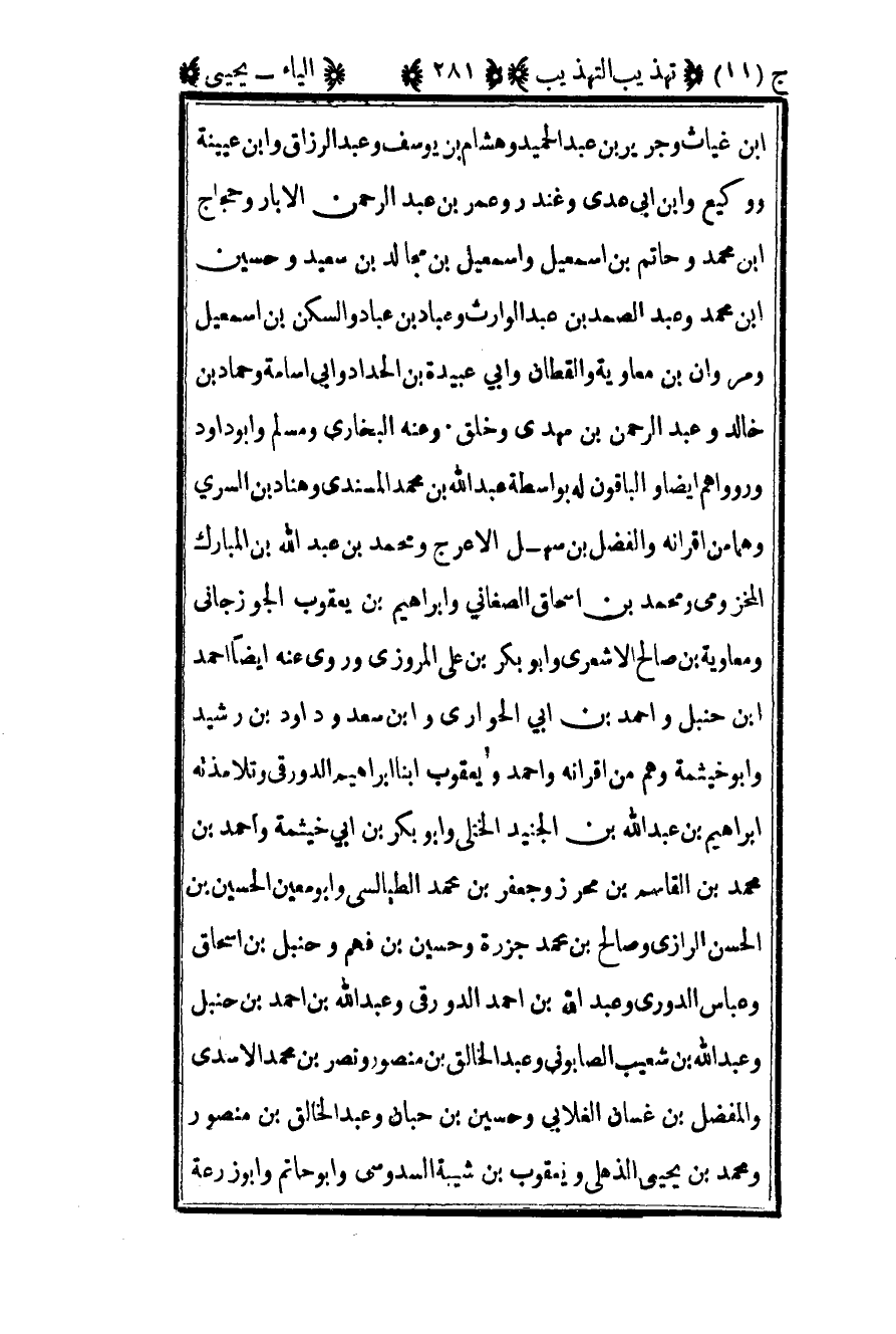 ابن غياث وجرير بن عبد الحميد وهشام بن يوسف وعبد الرزاق وابن عيينة ووكيع وابن أبي عدي وغندر وعمر بن عبد الرحمن الأبار وحجاج بن محمد وحاتم بن إسماعيل وإسماعيل بن مجالد بن سعيد وحسين بن محمد وعبد الصمد بن عبد الوارث وعباد بن عباد والسكن بن إسماعيل ومروان بن معاوية والقطان وأبي عبيد بن الحداد وأبي أسامة وحماد بن خالد وعبد الرحمن بن مهدي وخلق وعنه البخاري ومسلم وأبو داود ورووا هم أيضا والباقون له بواسطة عبد الله بن محمد المسندي وهناد بن السري وهما من أقرانه والفضل بن سهل الأعرج ومحمد بن عبد الله بن المبارك المخزومي ومحمد بن إسحاق الصغاني وإبراهيم بن يعقوب الجوزجاني ومعاوية بن صالح الأشعري وأبو بكر بن علي المروزي وروى عنه أيضا أحمد بن حنبل وأحمد بن أبي الحواري وابن سعد وداود بن رشيد وابوخيثمة وهم من أقرانه وأحمد ويعقوب ابنا إبراهيم الدورقي وتلامذته إبراهيم بن عبد الله بن الجنيد الختلي وأبو بكر بن أبي خيثمة وأحمد بن محمد بن القاسم بن محرز وجعفر بن محمد الطيالسي وأبو معين الحسين بن الحسن الرازي وصالح بن محمد جزرة وحسين بن فهم وحنبل بن إسحاق وعباس الدوري وعبد الله بن أحمد الدورقي وعبد الله بن أحمد بن حنبل وعبد الله بن شعيب الصابوني وعبد الخالق بن منصور ونصر بن محمد الأسدي والمفضل بن غسان الغلابي وحسين بن حبان وعبد الخالق بن منصور ومحمد بن يحيى الذهلي ويعقوب بن شيبة السدوسي وأبو حاتم وأبو زرعة