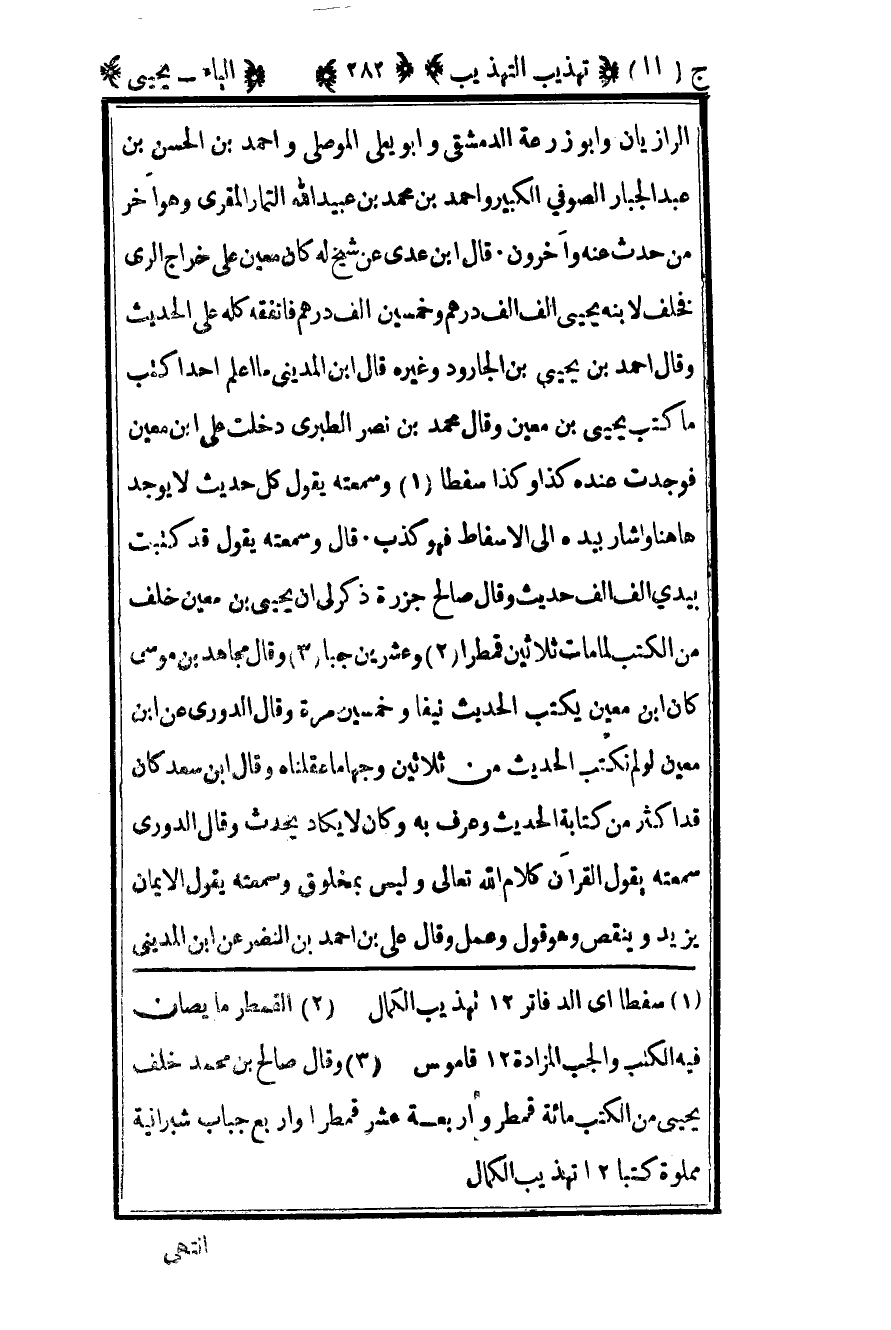 3 وقال صالح بن محمد خلف يحيى من الكتب مائة قمطر وأربعة عشر قمطرا وأربع جباب شبرانية مملوءة كتبا 12 تهذيب الكمال.