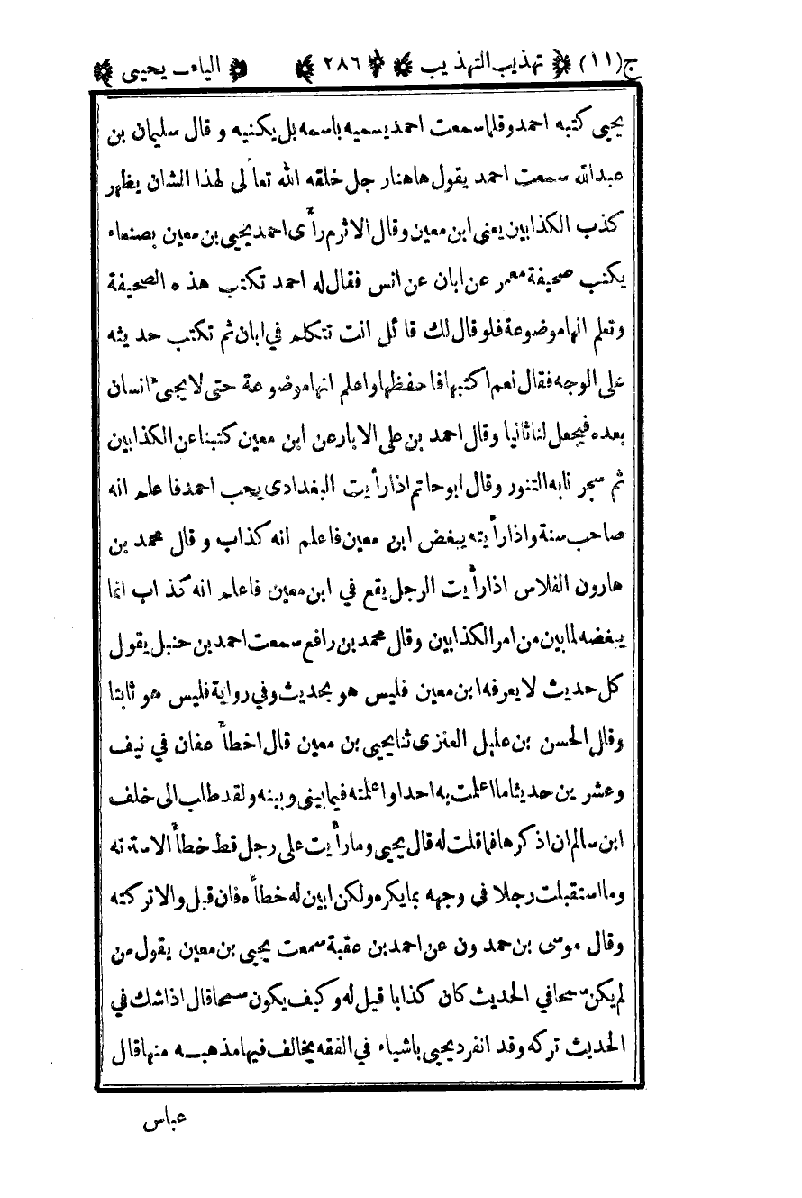 يحيى كتبه أحمد وقلما سمعت أحمد يسميه باسمه بل يكنيه وقال سليمان بن عبد الله سمعت أحمد يقول ها هنا رجل خلقه الله تعالى لهذا الشأن يظهر كذب الكذابين يعني بن معين وقال الأثرم رأى أحمد يحيى بن معين بصنعاء يكتب صحيفة معمر عن أبان عن أنس فقال له أحمد تكتب هذه الصحيفة وتعلم أنها موضوعة فلو قال لك قائل أنت تتكلم في أبان ثم تكتب حديثه على الوجه فقال نعم أكتبها فاحفظها وأعلم أنها موضوعة حتى لا يجيء إنسان بعده فيجعل لنا ثانيا وقال أحمد بن علي الأبار عن بن معين كتبنا عن الكذابين ثم سجرنا به التنور وقال أبو حاتم: إذا رأيت البغدادي يحب أحمد فاعلم أنه صاحب سنة وإذا رأيته يبغض بن معين فاعلم أنه كذاب وقال محمد بن هارون الفلاس إذا رأيت الرجل يقع في بن معين فاعلم أنه كذاب إنما يبغضه لما بين من أمر الكذابين وقال محمد بن رافع سمعت أحمد بن حنبل يقول كل حديث لا يعرفه بن معين فليس هو بحديث وفي رواية فليس هو ثابتا وقال الحسن بن عليل العنزي ثنا يحيى بن معين قال أخطأ عفان في نيف وعشرين حديثا ما أعلمت به أحدا واعلمته فيما بيني وبينه ولقد طلب إلى خلف بن سالم أن أذكرها فيما قلت له: قال يحيى وما رأيت على رجل قط خطأ إلا سترته وما استقبلت رجلا في وجهه بما يكره ولكن أبين له خطأه فإن قبل وإلا تركته وقال موسى بن حمدون عن أحمد بن عقبة سمعت يحيى بن معين يقول من لم يكن سمحا في الحديث كان كذابا قيل له وكيف يكون سمحا قال إذا شك في الحديث تركه وقد انفرد يحيى بأشياء في الفقه يخالف فيها مذهبه منها قال