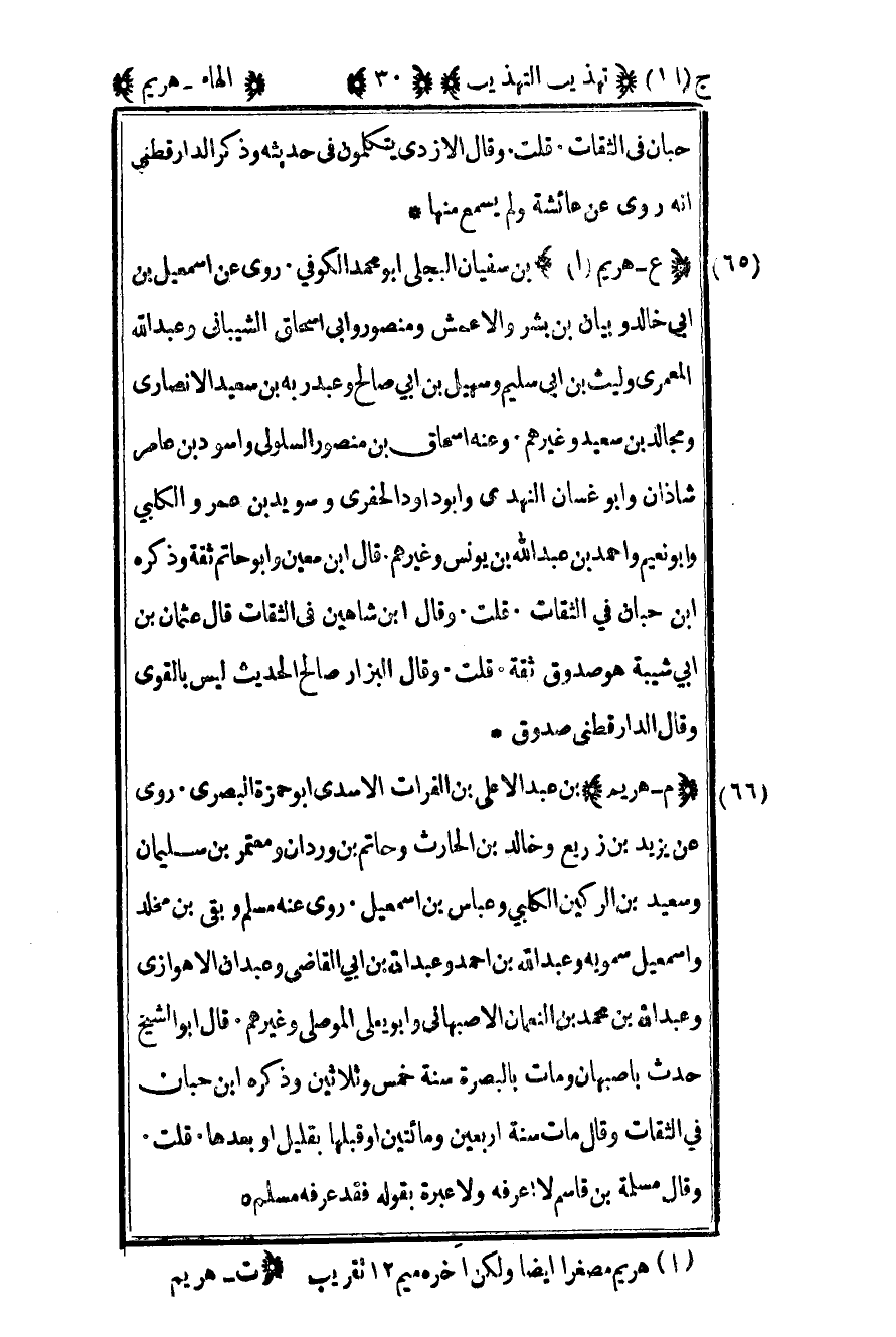 65 – "ع – هريم1" ابن سفيان البجلي أبو محمد الكوفي روى عن إسماعيل بن أبي خالد وبيان بن بشر والأعمش ومنصور وأبي إسحاق الشيباك وعبد الله المعمري وليث بن أبي سليم وسهيل بن أبي صالح وعبد ربه بن سعيد الأنصاري ومجالد بن سعيد وغيرهم وعنه إسحاق بن منصور السلولي وأسود بن عامر شاذان وأبو غسان النهدي وأبو داود الحفري وسويد بن عمر والكلبي وأبو نعيم وأحمد بن عبد الله بن يونس وغيرهم قال بن معين وأبو حاتم ثقة وذكره بن حبان في الثقات قلت: وقال بن شاهين في الثقات قال عثمان بن أبي شيبة هو صدوق ثقة قلت: وقال البزار صالح الحديث ليس بالقوي وقال الدارقطني: صدوق.